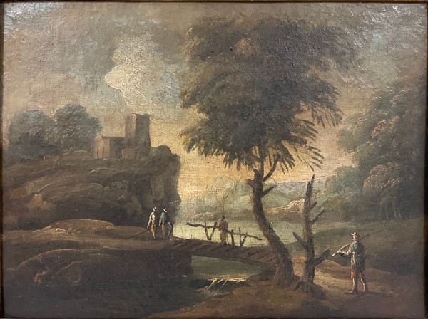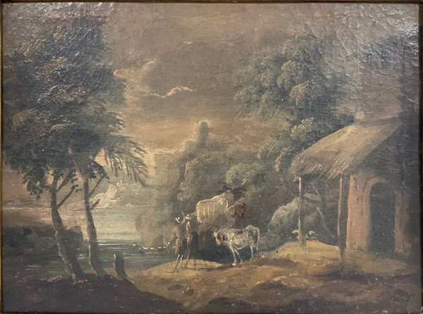 Scuola del XVIII secolo, coppia di dipinti raffiguranti paesaggi con figure, ol