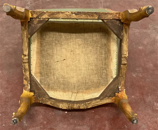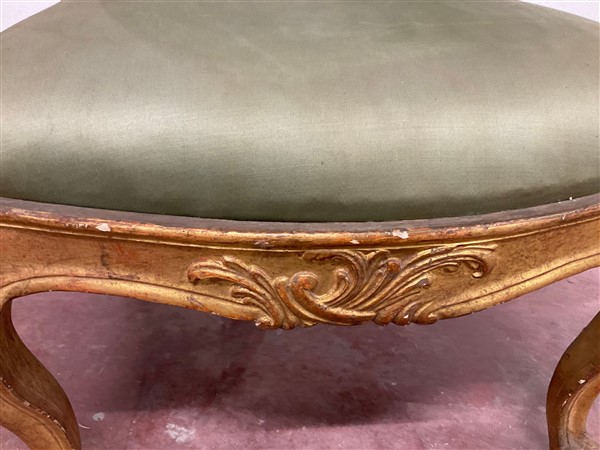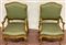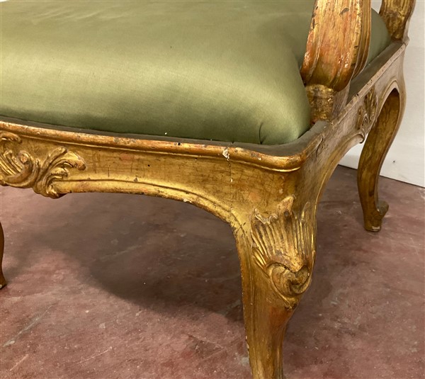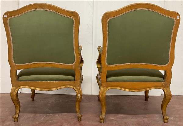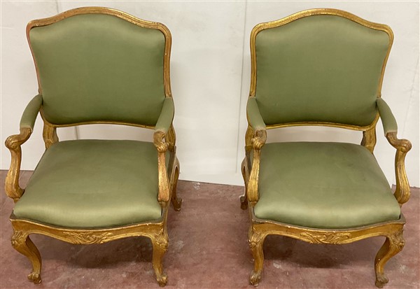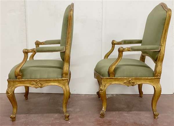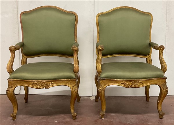 Coppia di poltrone in legno intagliato e dorato con schienale e braccioli sagomati. Fascia e gambe intagliate a motivi vegetali. Secolo XVIII (restauri alla doratura)