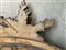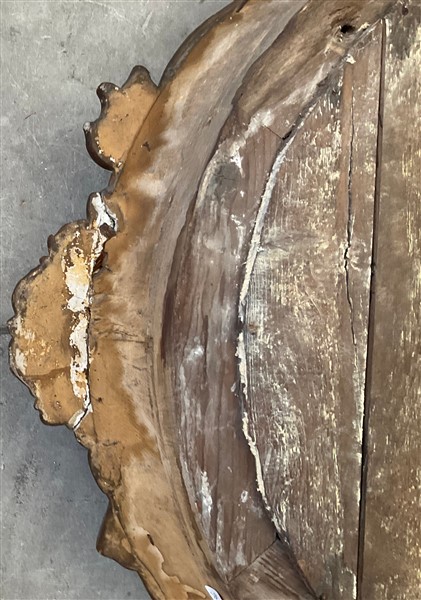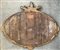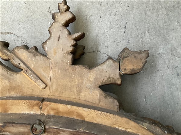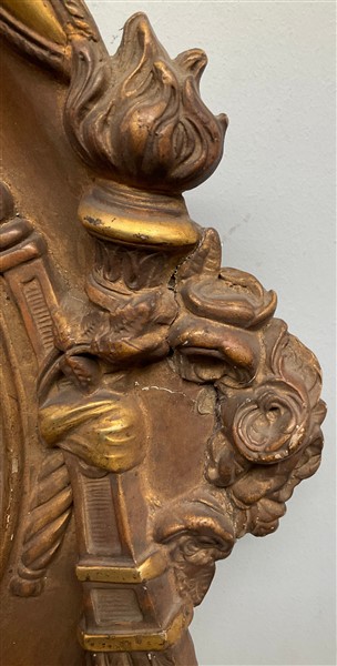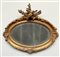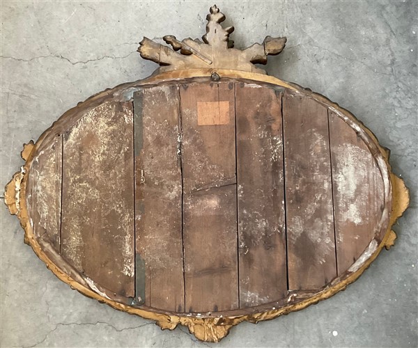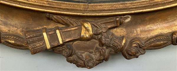 Specchio di forma ovale in legno e pastiglia dorata decorata a rilievo nella cimasa a volatili, faretra e fiaccola, e a trionfi ai lati. Secolo XIX (cm 104x90)