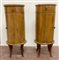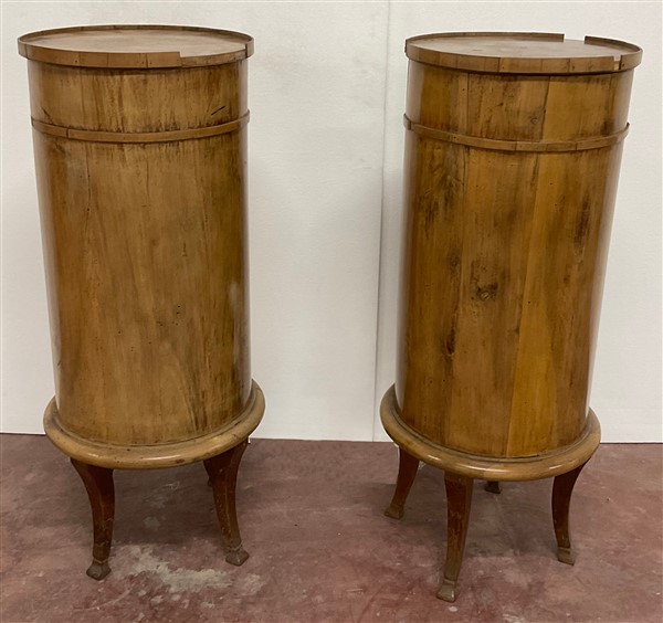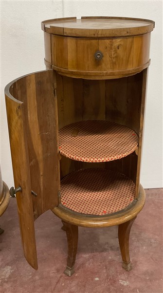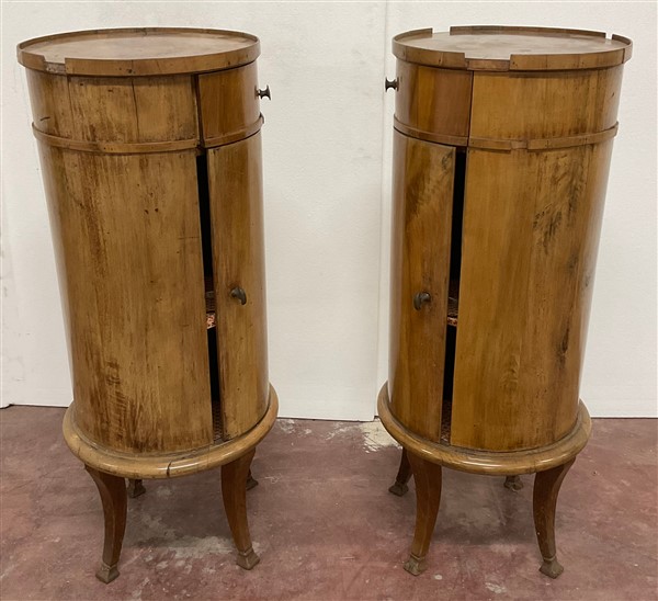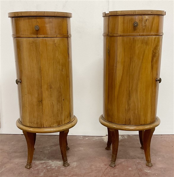 Coppia di comodini a colonna lastronati in noce ad un cassetto ed un'anta poggiante su quattro piedi sagomati. Secolo XIX (difetti) (h. cm 94; d. cm 37)