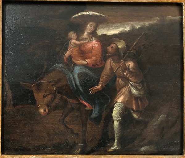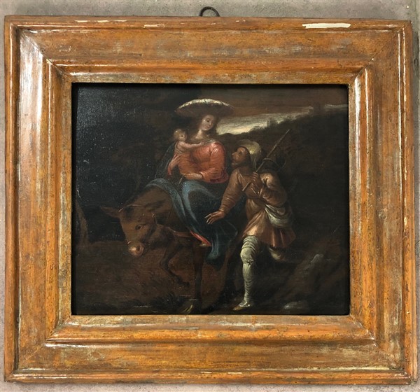 Lotto 1893 | Ignoto del secolo XVII " Fuga in Egitto" Olio su tavola (cm 26x31) In cornic