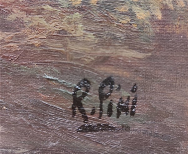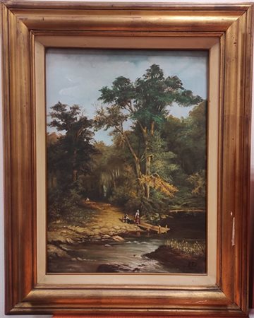 Ignoto del XX secolo "Paesaggio fluviale con contadini" olio su cartone telat