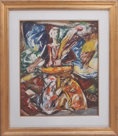 "La venditrice di fiori", olio su tela, firmato e datato in basso a destra e titolato al retro (cm 53x44) in cornice