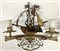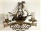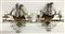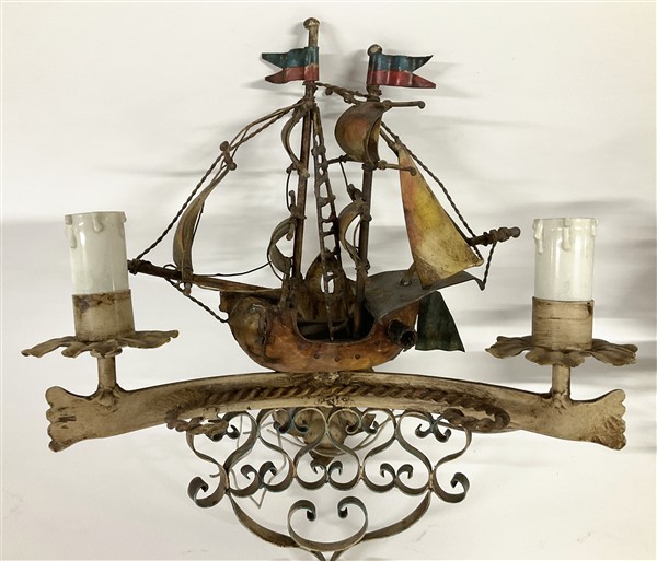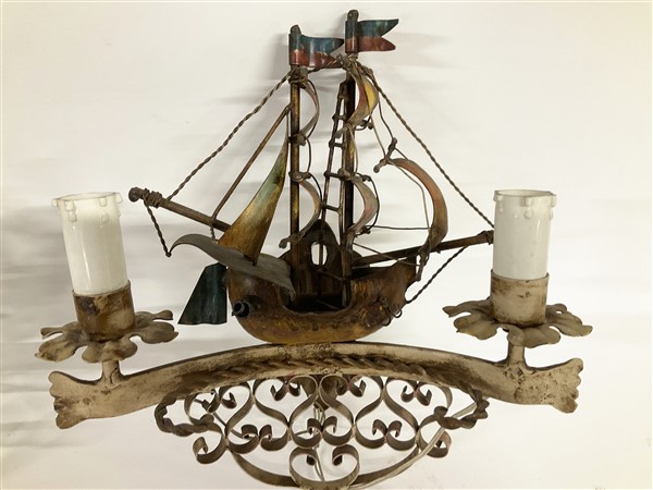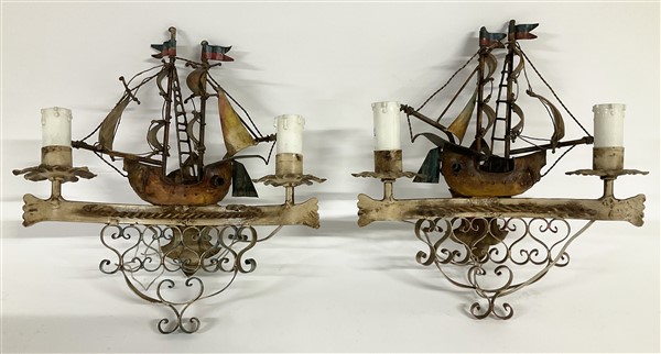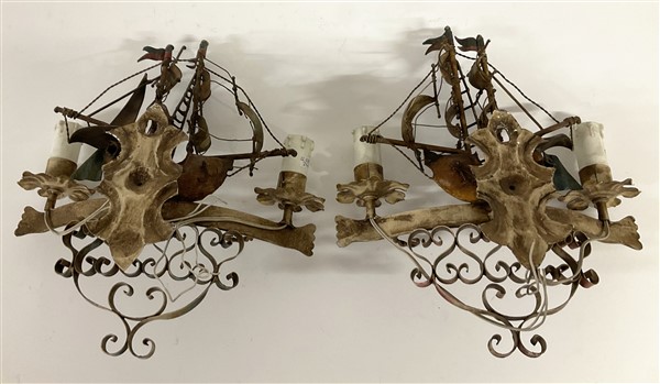 Coppia di appliques a due fiamme in metallo dipinto in policromia decorate con figura di caravella tutto tondo (cm 34x30) (difetti)