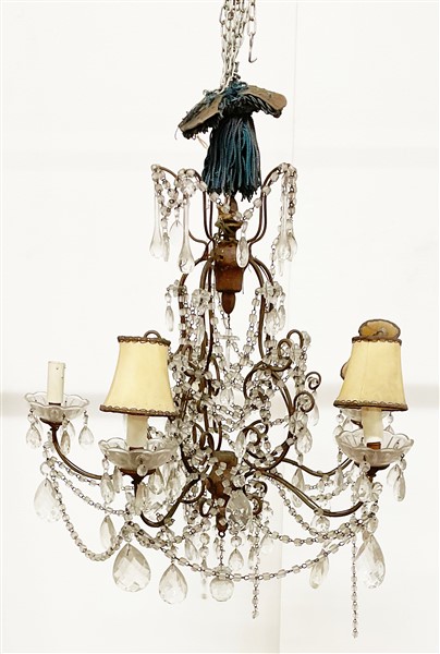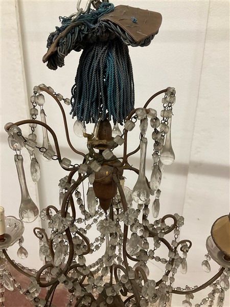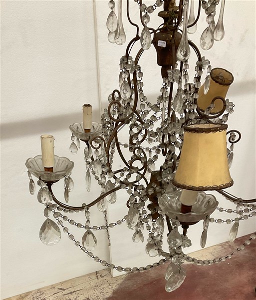 Lampadario a cinque luci in ferro forgiato decorato da pendagli in cristallo sfaccettato (difetti)