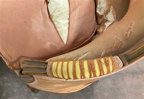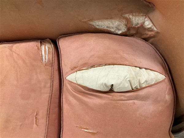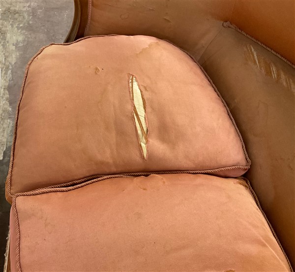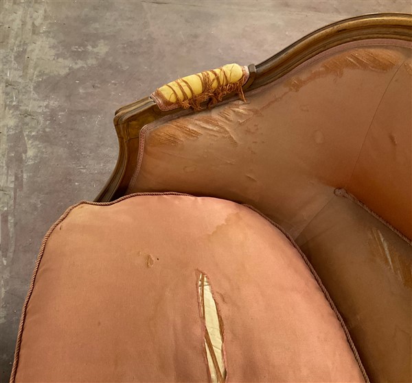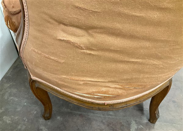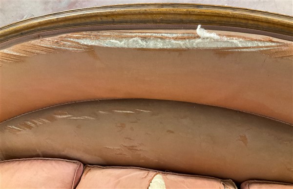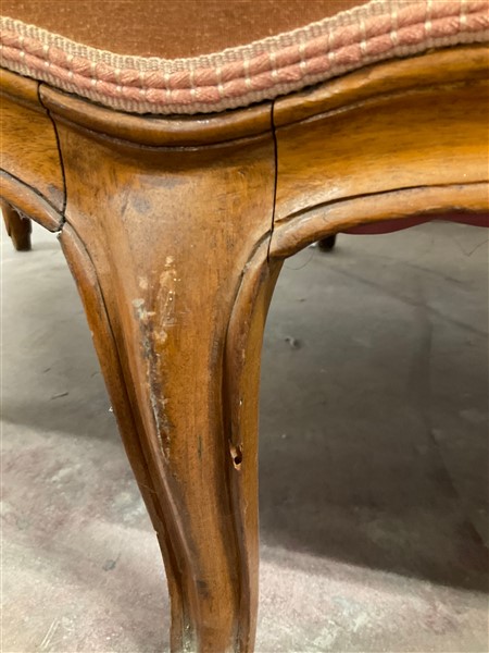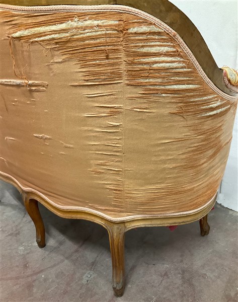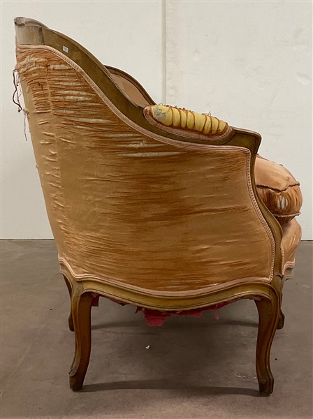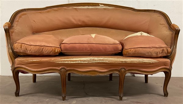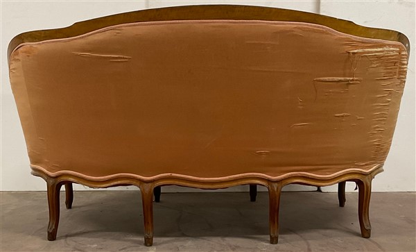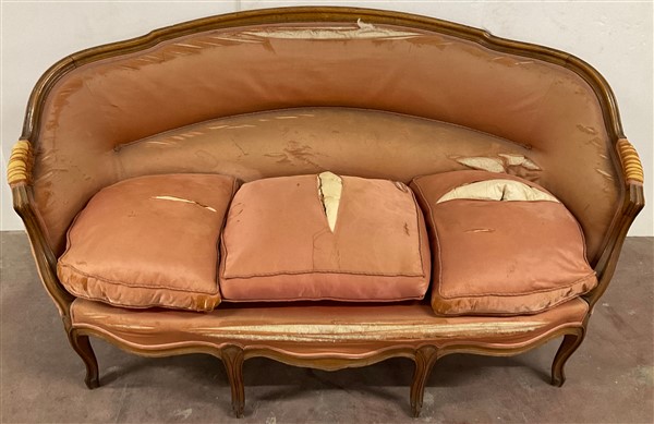 Divano in legno intagliato con schienale, braccioli e gambe di forma mossa (cm 155x111x65 circa) (difetti e restauri)