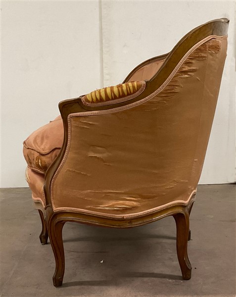 Divano in legno intagliato con schienale, braccioli e gambe di forma mossa (cm