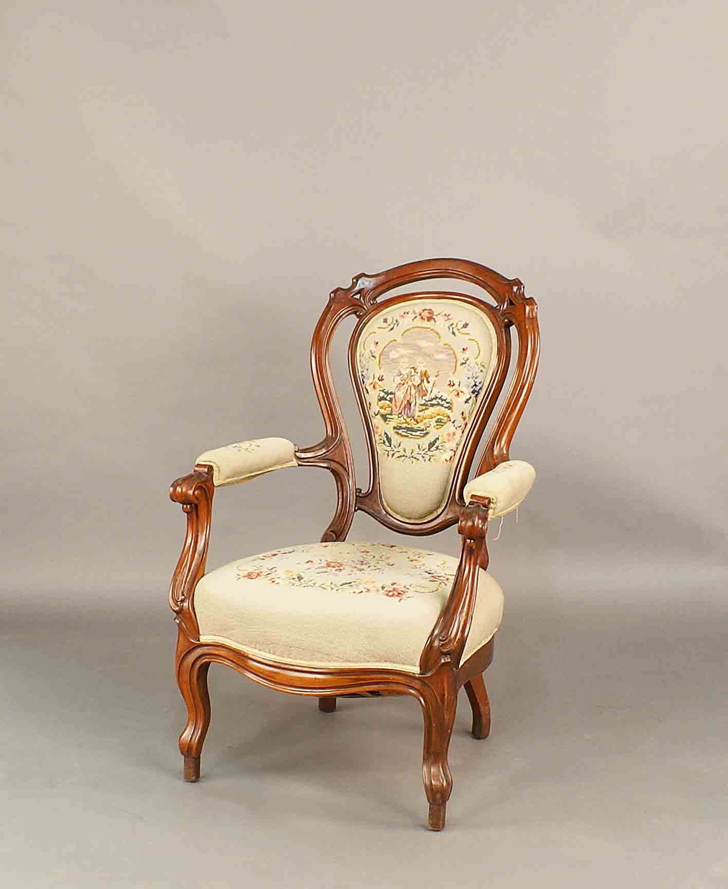 Poltrona in mogano, schienale sagomato, imbottita e rivestita a piccolo punto, h. cm. 100.