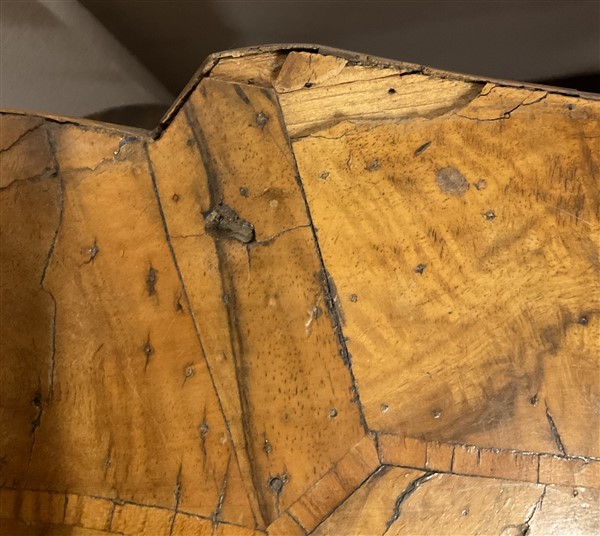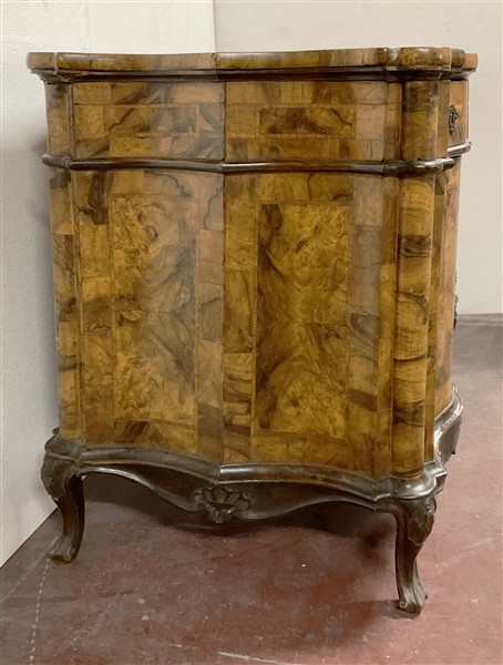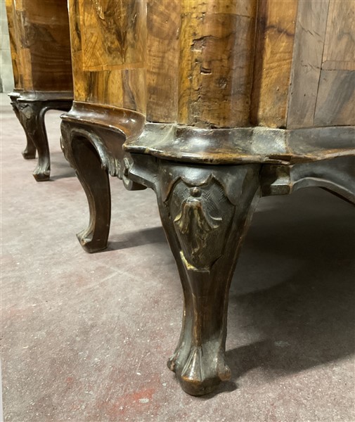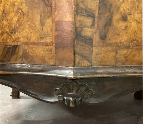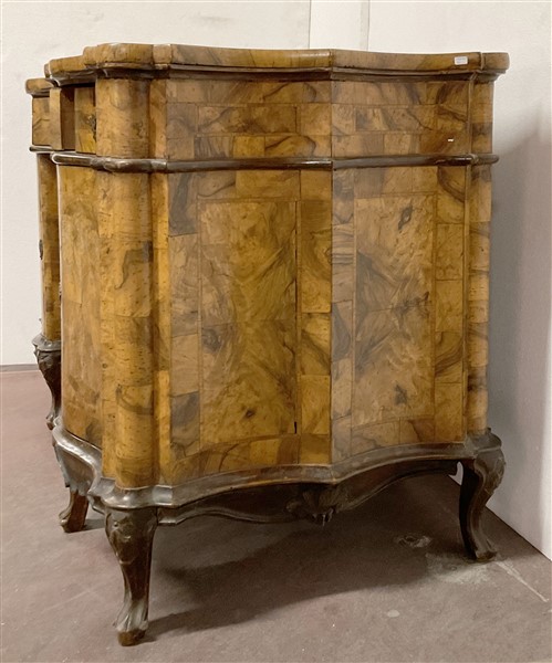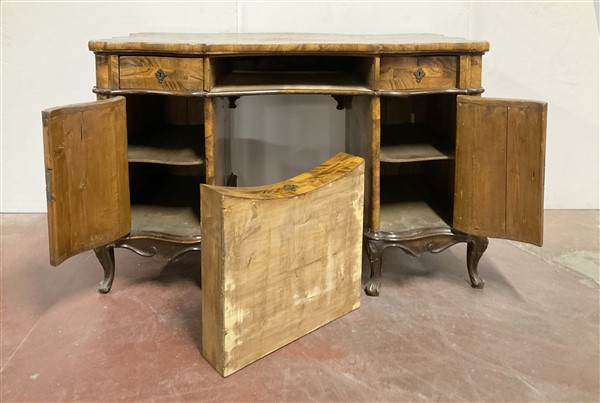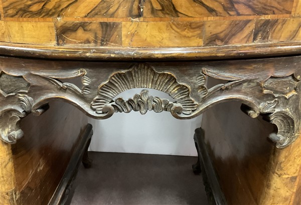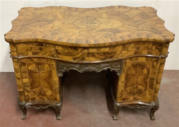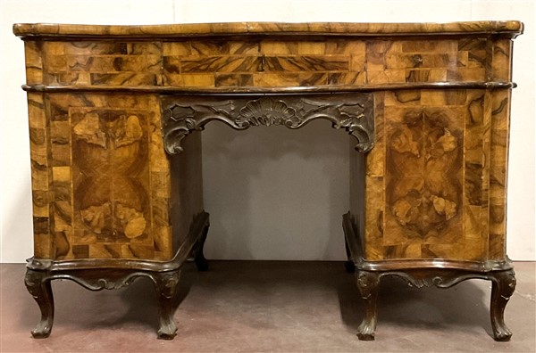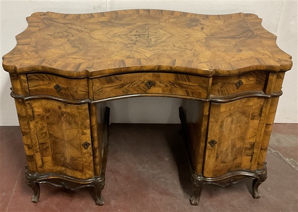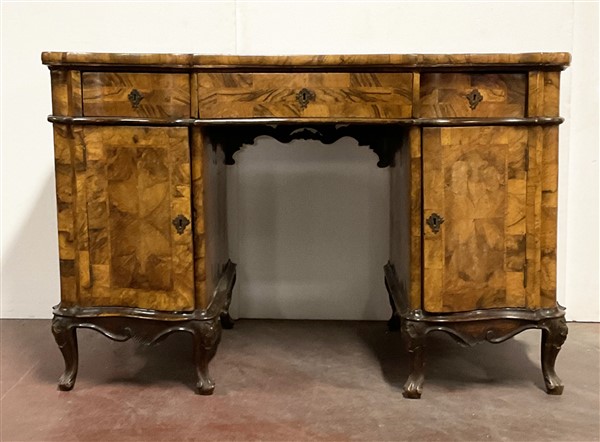 Scrivania da centro lastronata in radica di noce mossa sul fronte e sui fianchi tre cassetti in linea e due ante. Grembiule e piedi intagliati. Veneto, secolo XX (cm 125x80x72 (difetti)