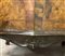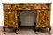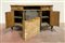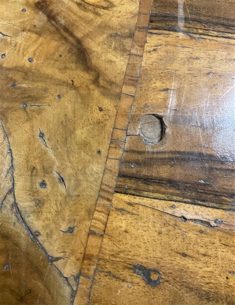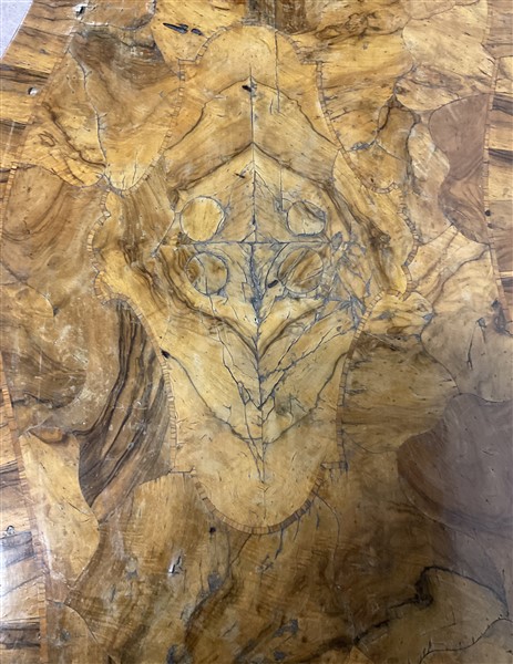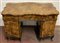 Scrivania da centro lastronata in radica di noce mossa sul fronte e sui fianchi