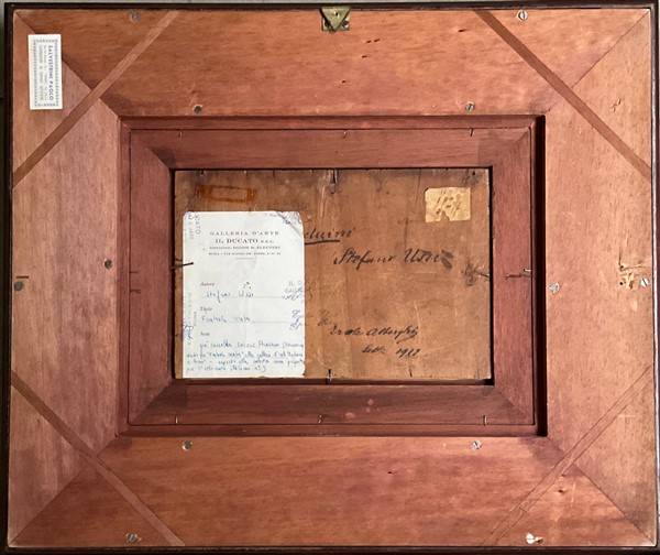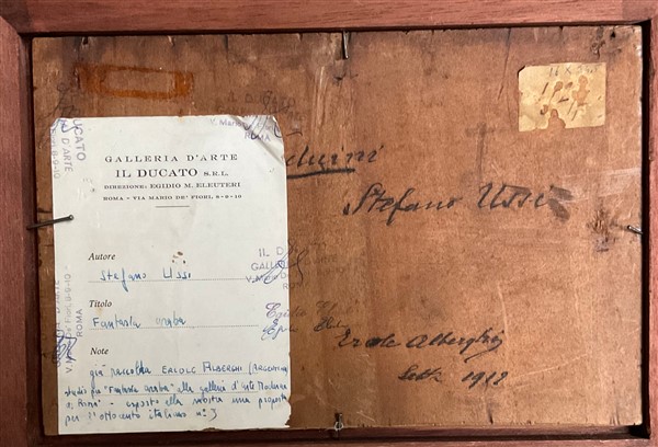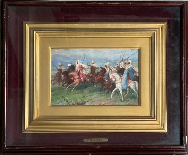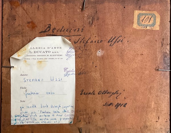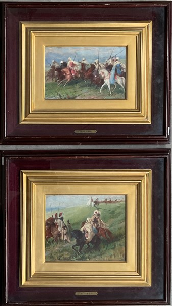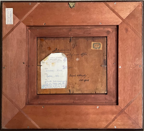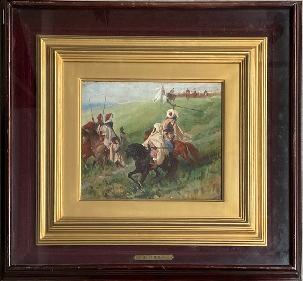 Ignoto, Lotto di due dipinti ad olio su tavola rappresentanti "Beduini" (cm 25x20) In cornici. Uno reca in basso a sx la firma S. Ussi, al retro: iscrizioni e cartigli Prov: Collezione Vera Bosi e Carlo Zaila, Roma