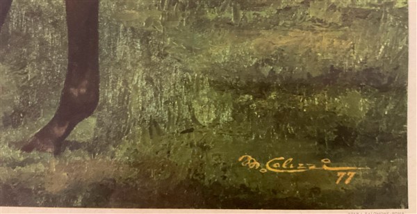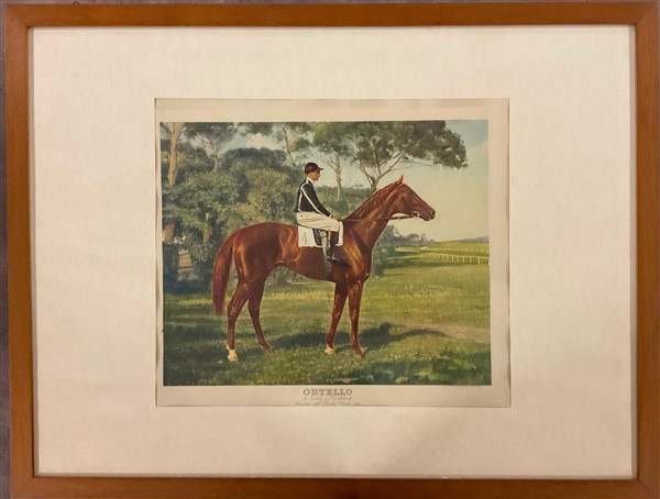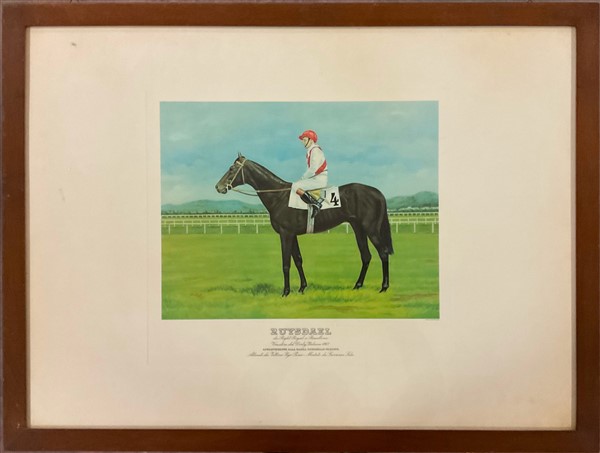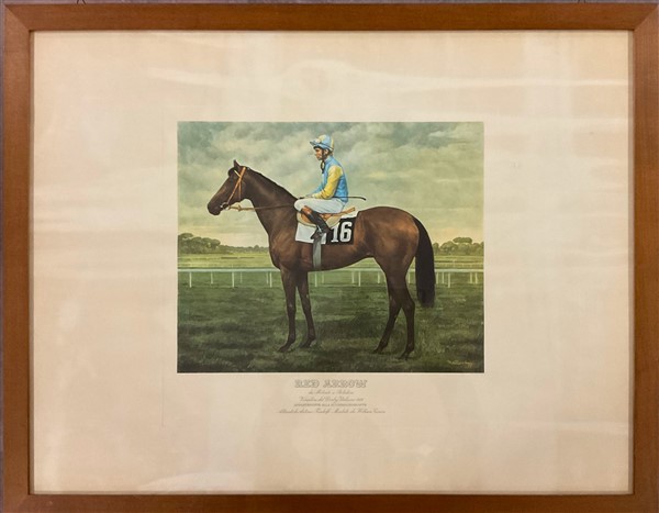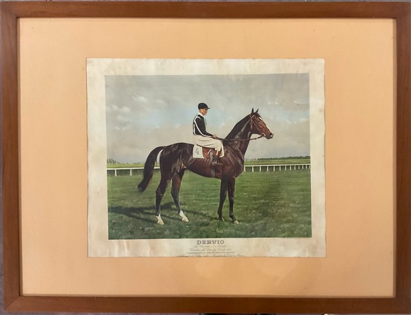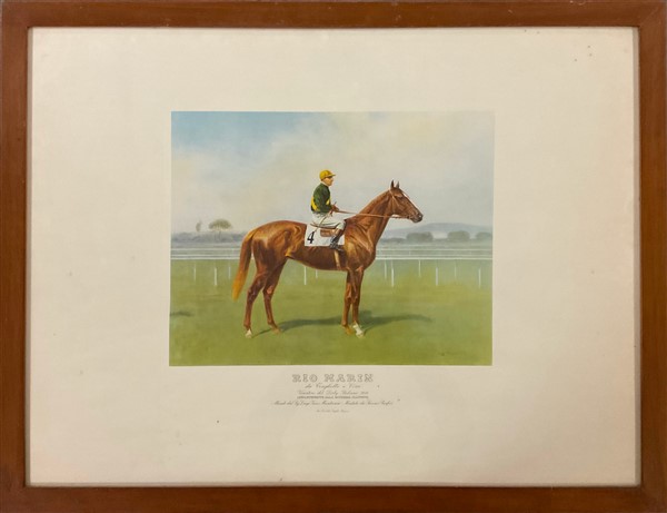 Gruppo di sei fotocalcografie a colori raffiguranti cavalli da corsa con fantini (cm 65x88) in cornice (difetti)