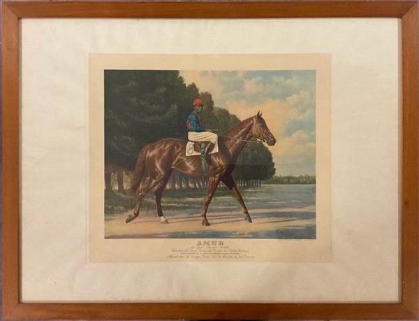 Gruppo di sei fotocalcografie a colori raffiguranti cavalli da corsa con fantin
