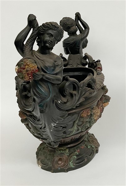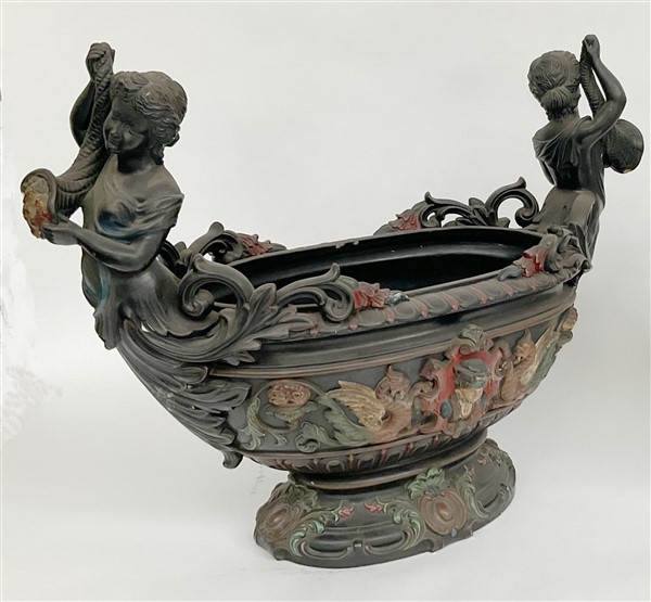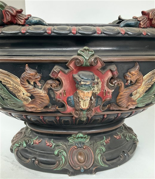 Manifattura austriaca, J. Maresch, fine secolo XIX. Centrotavola in terracotta decorato in policromia su fondo nero, a coppa con anse a figure femminili reggenti cornucopie. Fascia con grifoni e busto maschile a rilievo entro scudo, bordi baccellati. Marca impressa nel fondo (cm 62x49x29) (difetti e rotture)