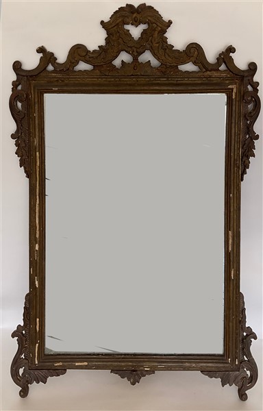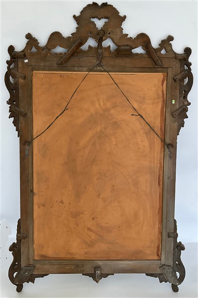 Antica specchiera in legno intagliato, traforato e dorato a mecca con cimasa e fregi a volute contrapposte e motivi floreali (cm 98x145) (difetti e restauri)