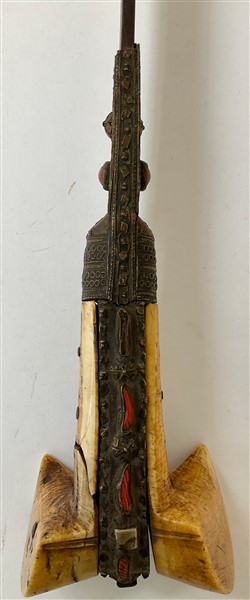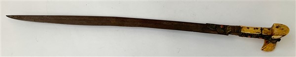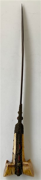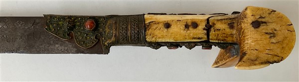 Yatagan, Impero Ottomano, secolo XIX. Tipica impugnatura in osso ad orecchie arricchita da cabochon in pietra dura e parti in argento cesellate a motivi geometrici. Forte lama con tracce di antica incisione e agemine. Senza fodero (L.cm 77) (un lato dell impugnatura presenta dei danni da restaurare)