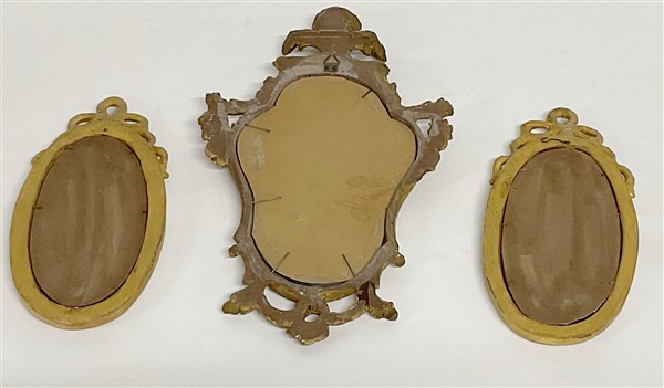 Lotto composto da tre specchierine in legno intagliato e dorato a volute, fiori e nastri (h. max cm 43,5) (difetti)