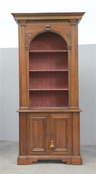 Mobile a due corpi in noce con parte inferiore a due battenti e piedi a mensola, parte superiore a giorno a quattro ripiani (cm 105x237x45)(difetti)