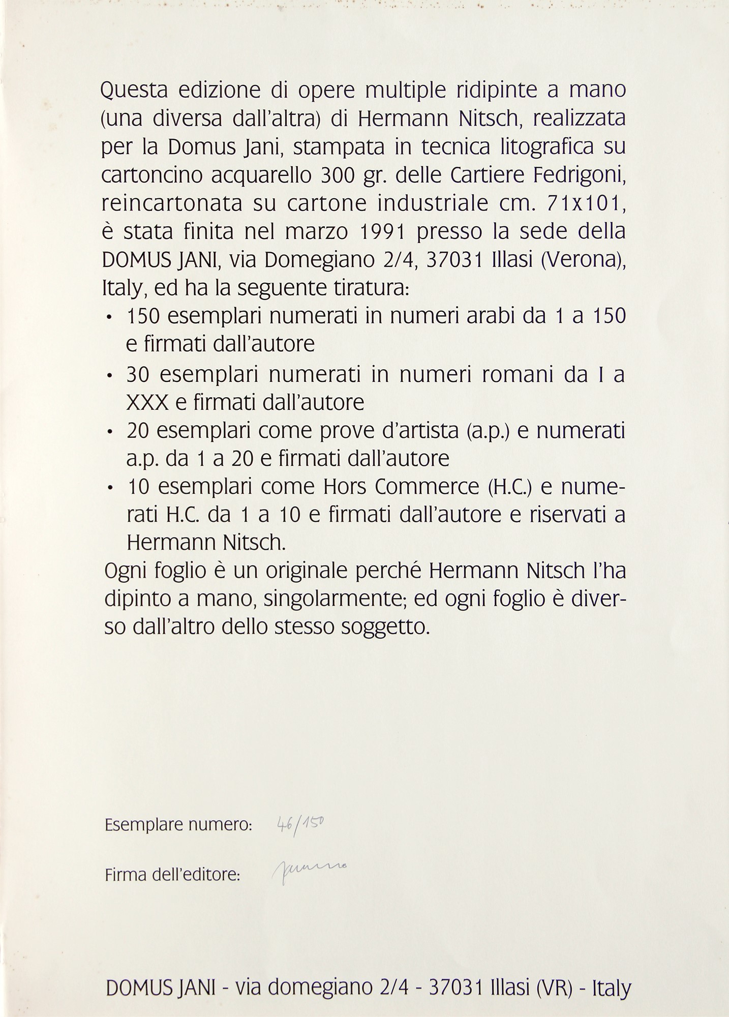 Numerazione, firma "46/150, Hermann Nitsch" (in basso a destra)