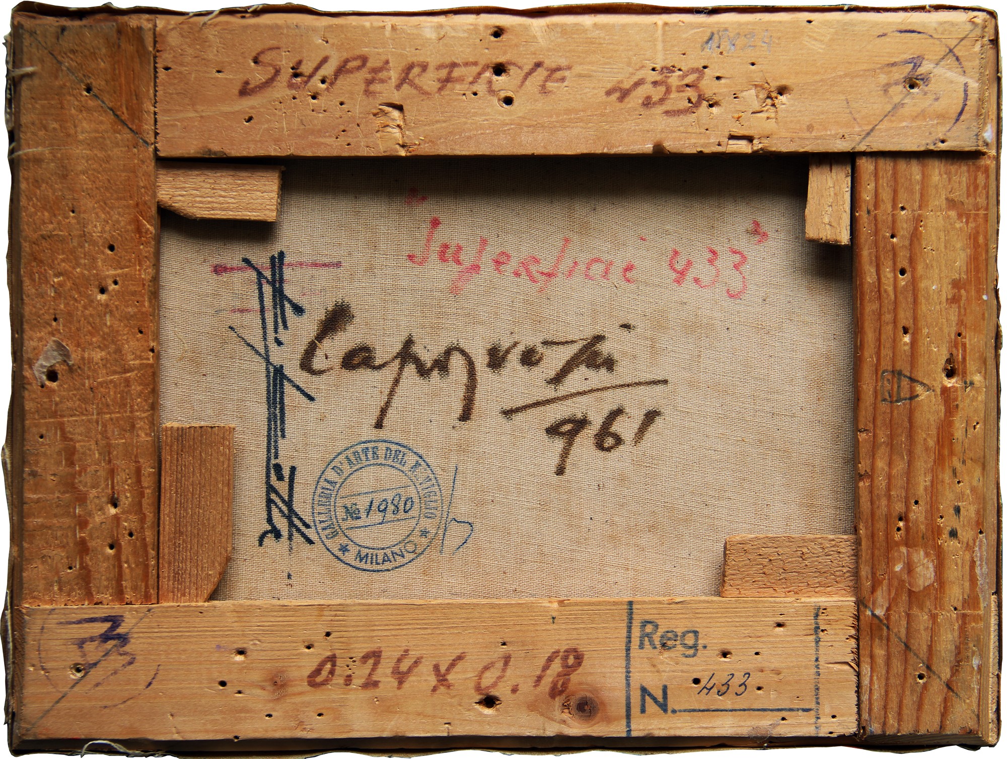 Titolo, firma, data "Superficie 433, Capogrossi, 961";