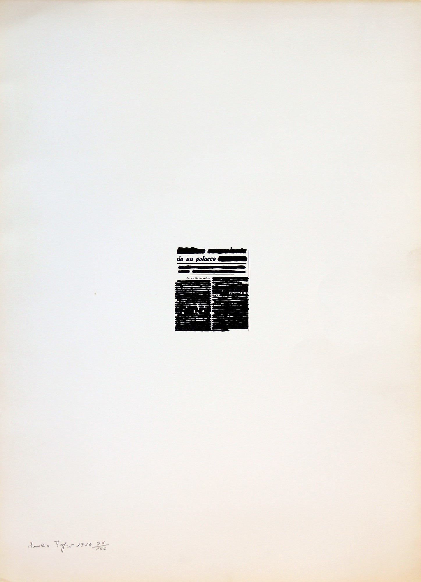 Firma, data, numerazione " Emilio Isgrò, 1964, 96/150" (in basso a sinistra)