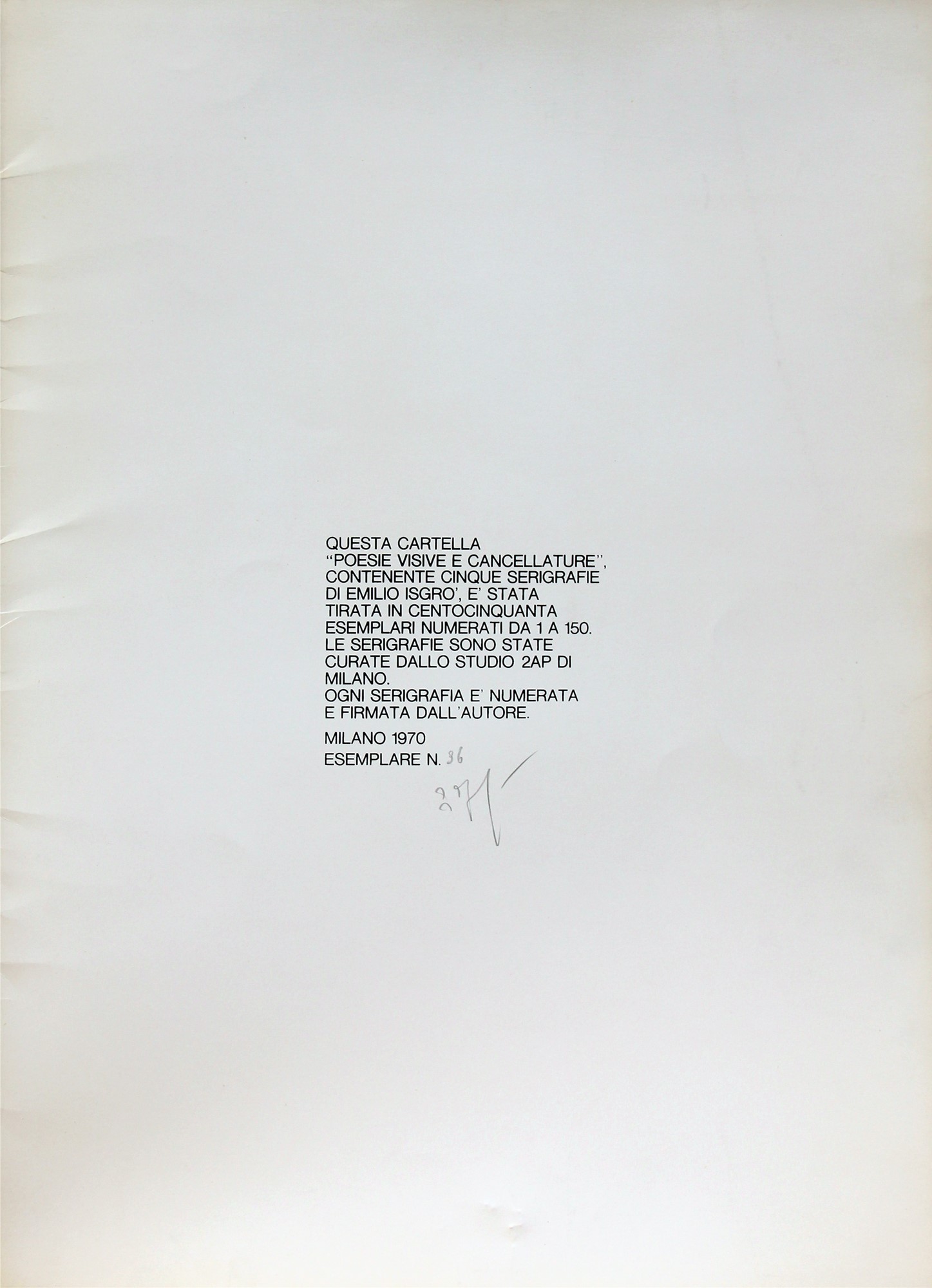 Poesie visive e cancellature, 1970, Cartella completa di cinque serigrafie su carta, cm 70x50 (ogni opera)
