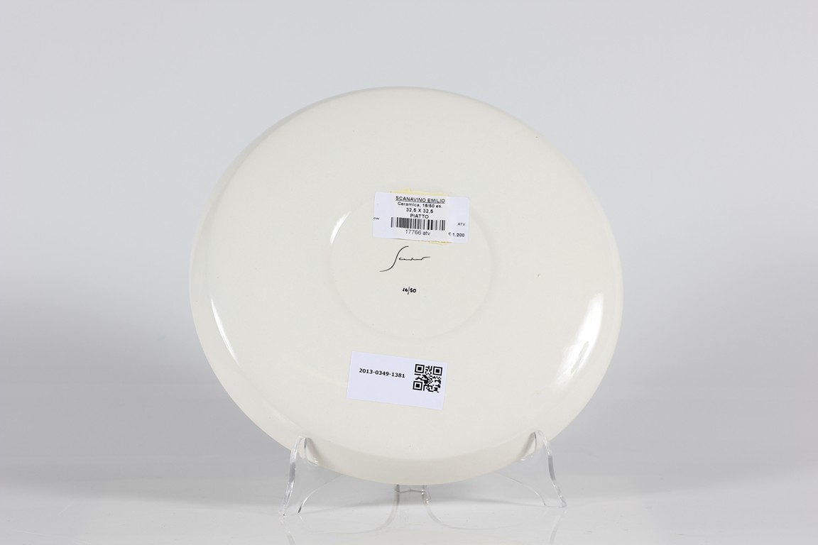 SCANAVINO EMILIO (1922 - 1986) Piatto in ceramica. Serigrafia su ceramica. . Diametro 32 cm. Tir.16/50 e firma serigrafati al retro.