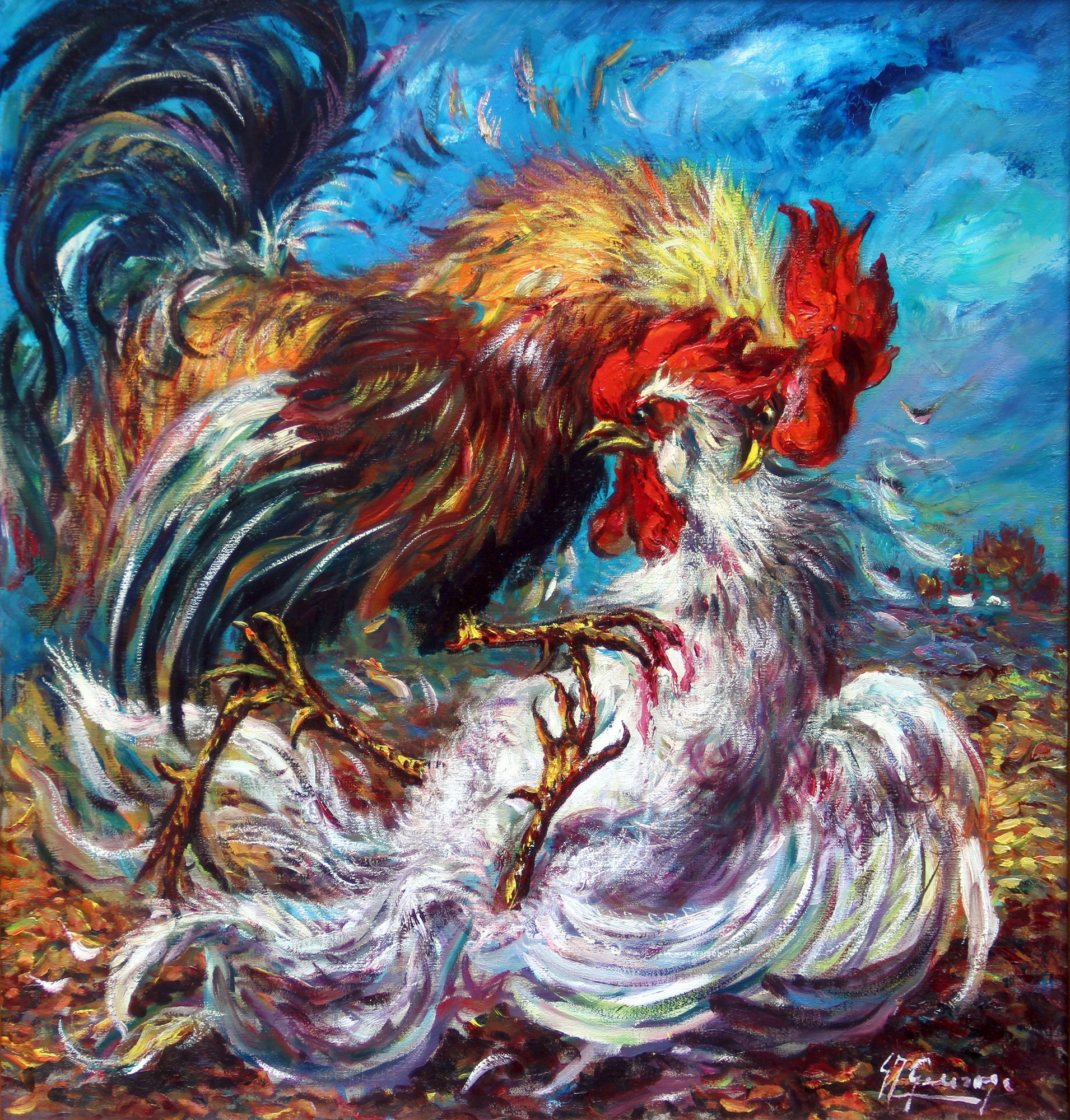 Galli in lotta, 1977, olio su tela, cm 70x70