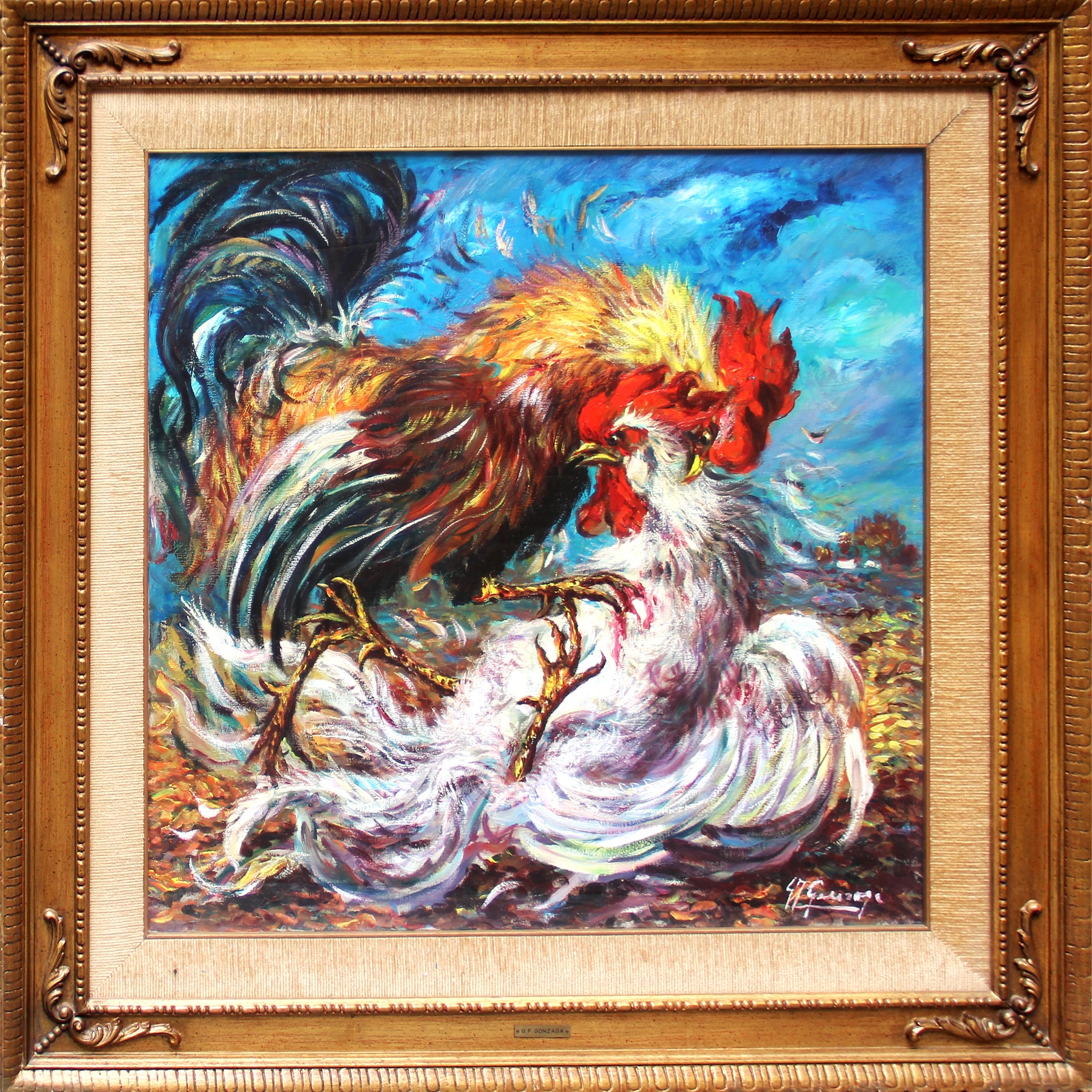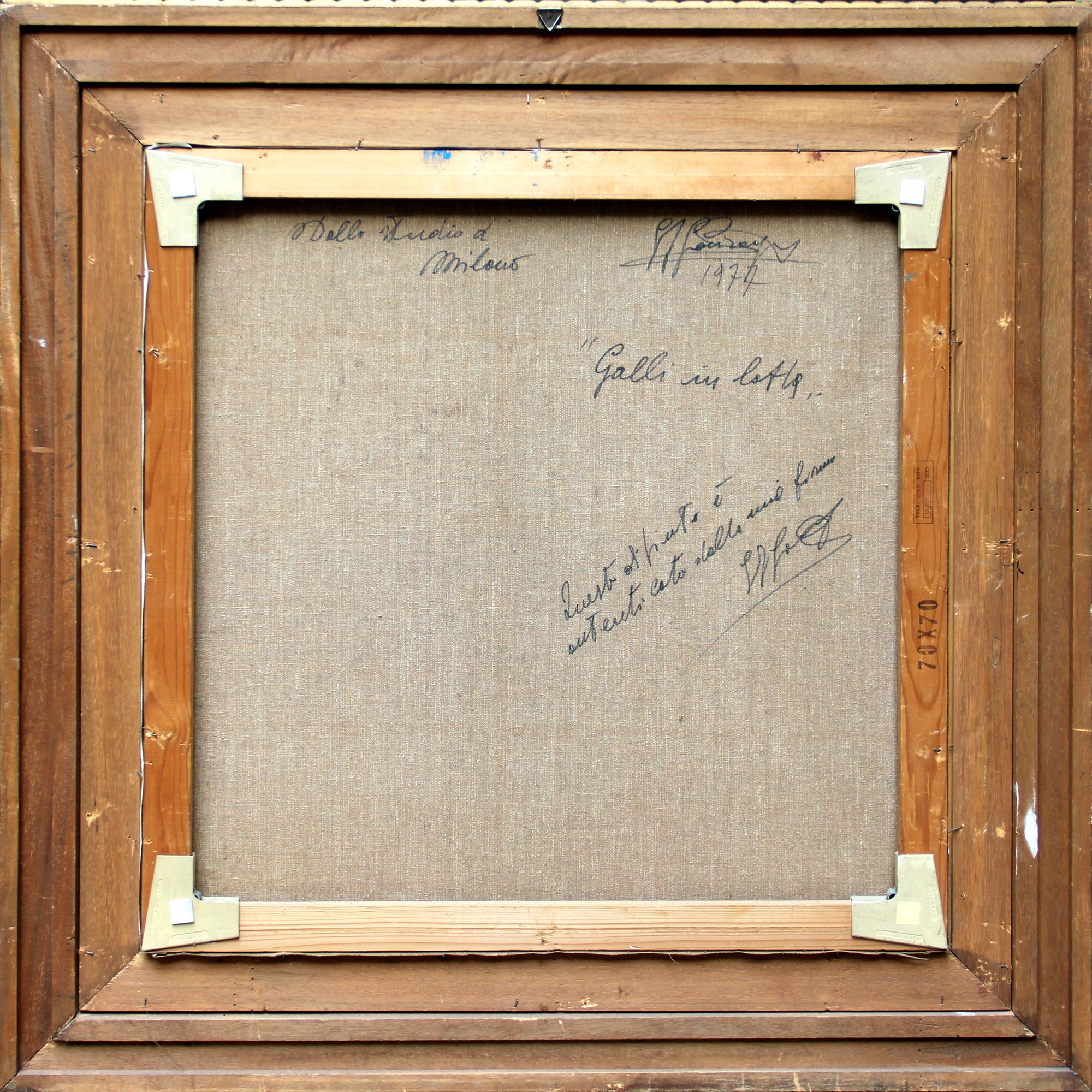 Luogo, firma, data, titolo, dichiarazione di autenticità "Dallo studio di Milano, G.F. Gonzaga, 1977, Galli in lotta, Questo dipinto è autenticato dalla mia firma G.F. Gonzaga" (al retro)