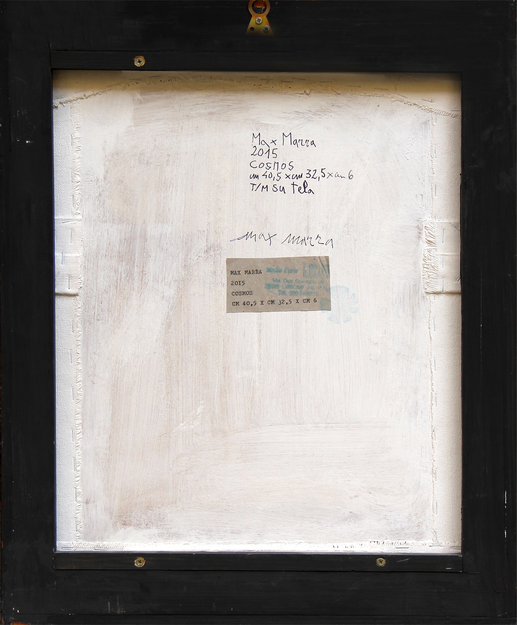 Firma, data, titolo, misura, tecnica, firma "Max Marra, 2015, Cosmos, cm 40,5 x cm 32,5 x cm 6, t/m su tela, Max Marra"