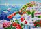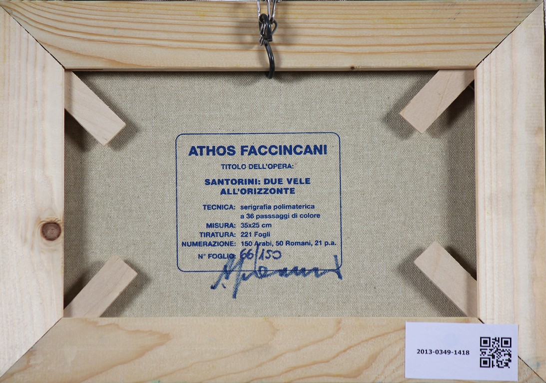 FACCINCANI ATHOS (n. 1951) Santorini: due vele all'orizzonte. Serigrafia polimaterica. Cm 35,00 x 25,00. Tir. 66/150 e firma in basso. Al retro timbro dell'artista riportante firma, tir. e titolo.