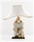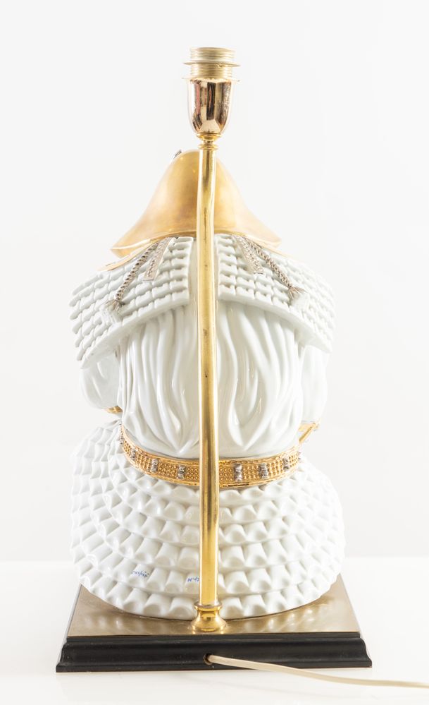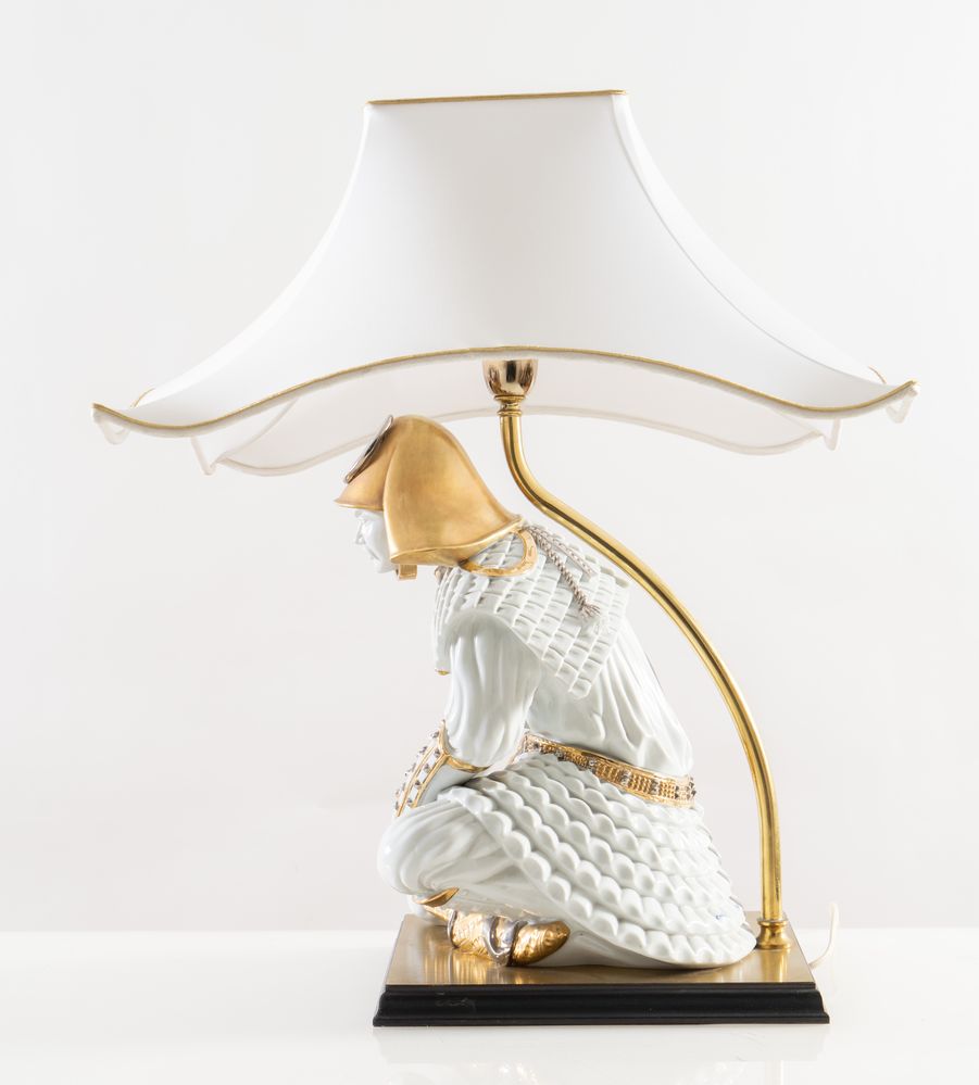 CARPIE' Lampada da tavolo con base in legno e metallo, il corpo in porcellana smalatata e paralume in tessuto. Marchio originale. Prod. Carpiè, Italia, 1980 ca. Cm 66x53x53