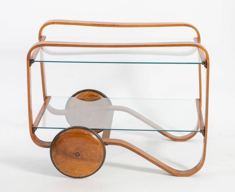 Carrello in legno con ripiani in vetro. Lievi difetti. Prod. Italia, 1960 ca....