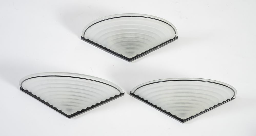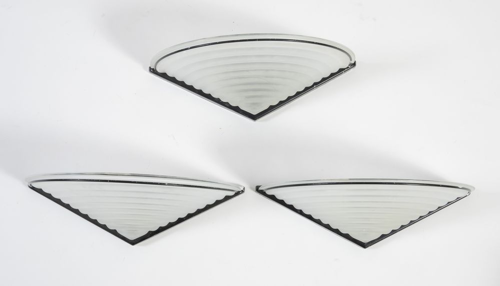 Tre lampade da parete con struttura in metallo verniciato e paralume in vetro satinato. Lievi difetti. Prod. Italia, 1980 ca. Cm 23x40x12