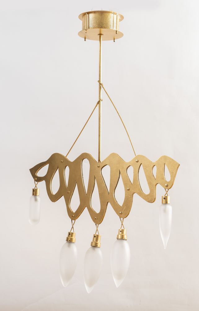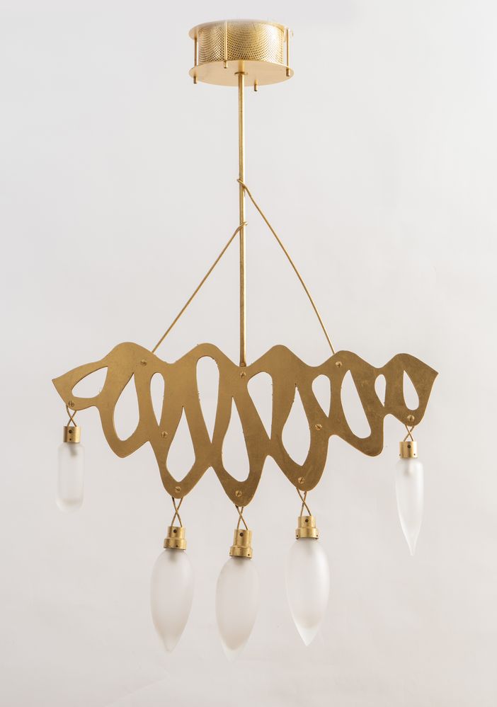 SERGIO TERZANI Lampadario con struttura in metallo e paralumi in vetro satinato. Etichetta del produttore. Prod. Sergio Terzani, Italia, 1980 ca. Cm 100x62x19