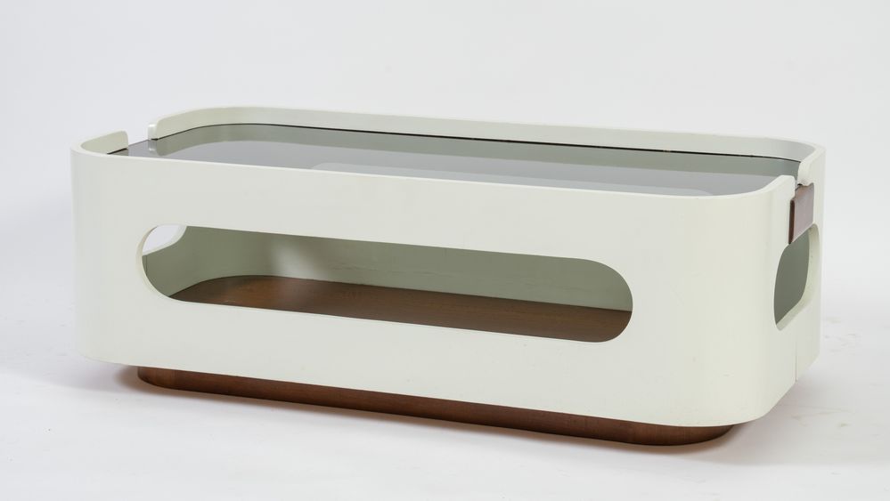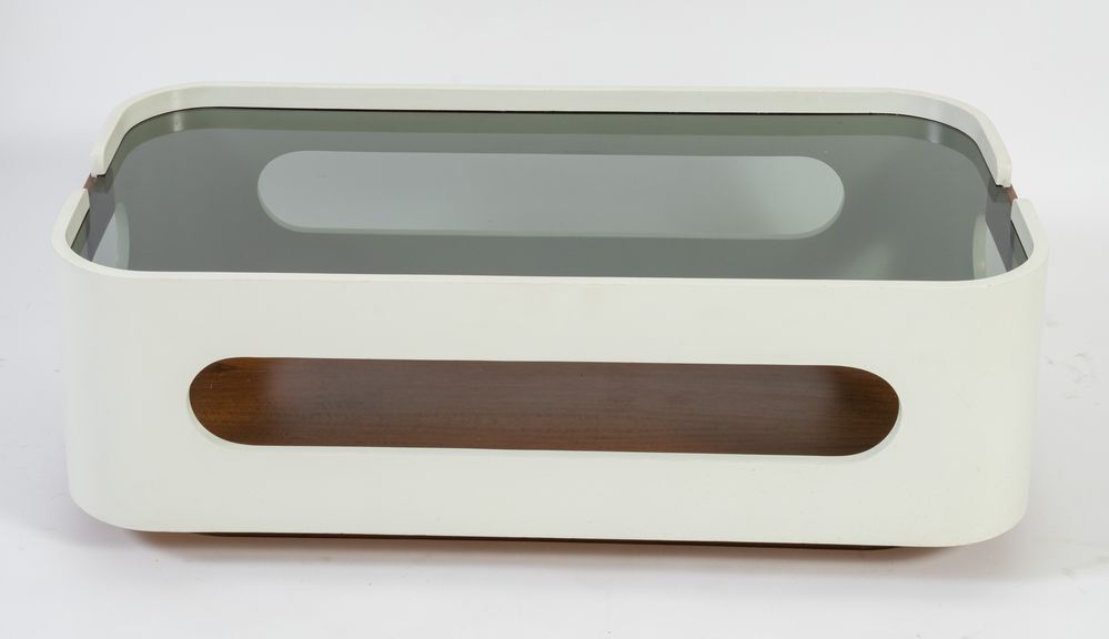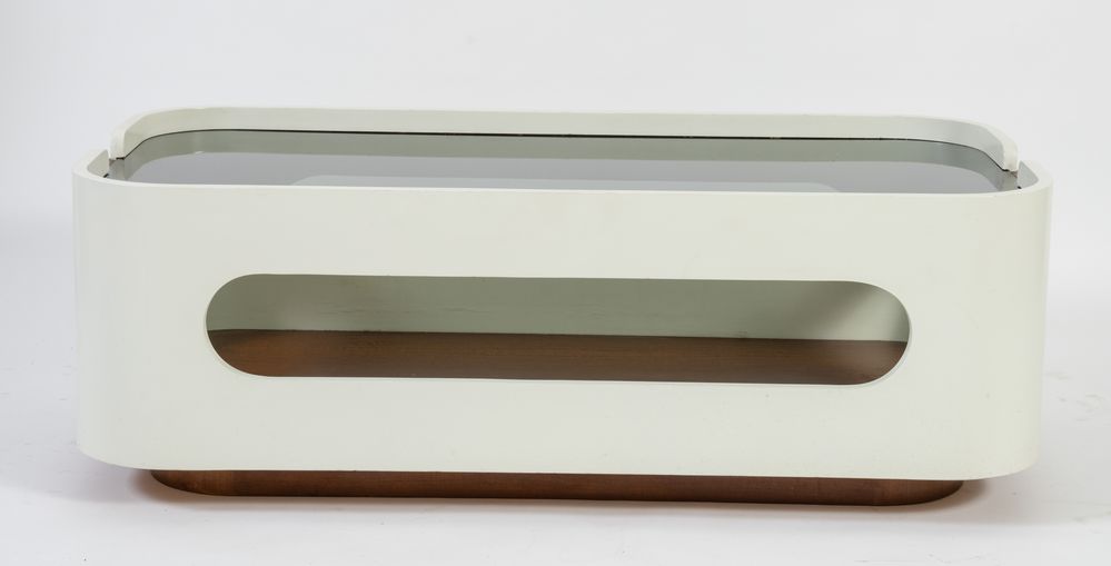 Tavolino da salotto con struttura in legno laccato e piano in vetro. Prod. Italia, 1970 ca. Cm 35,5x52,5x103,5