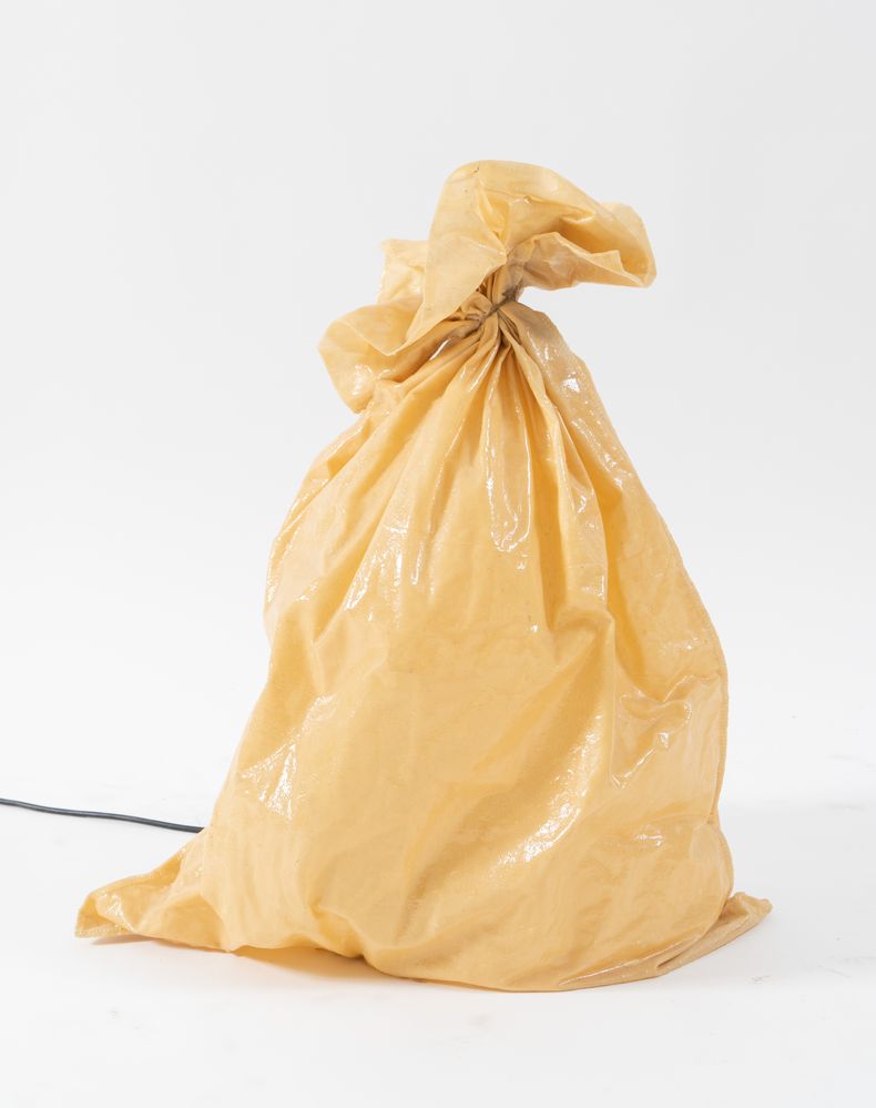 DABU' Lampada da terra in fibra naturale resinata modello 'Sacco di luce'. Prod. Dabù, Italia, 2000 ca. Cm 60x58x34