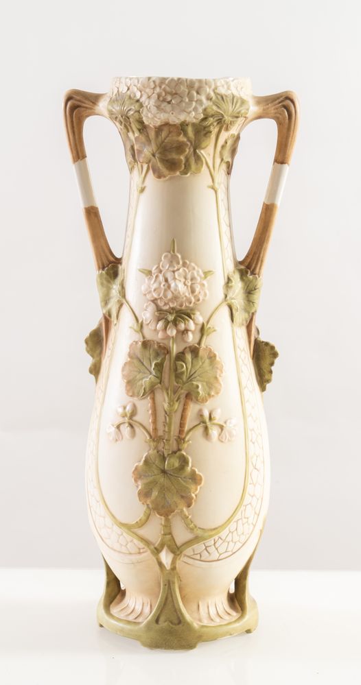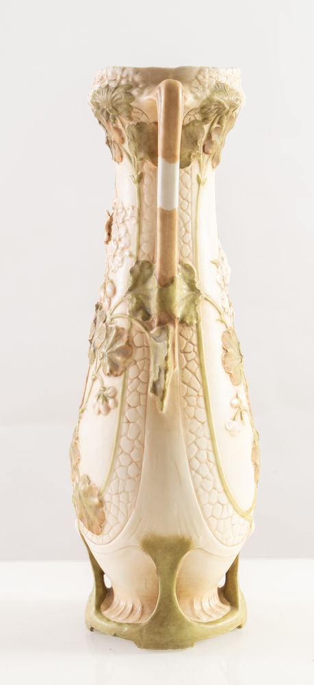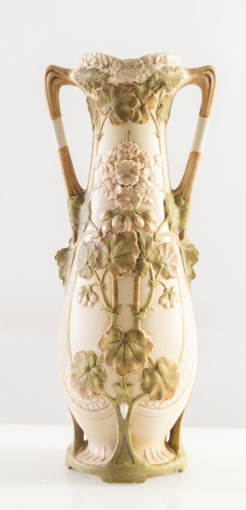 ROYAL DUX Vaso in porcellana policroma. Marchio originale. Prod. Royal Dux, Bohemia, Repubblica Ceca, 1960 ca. Cm 49x20x17