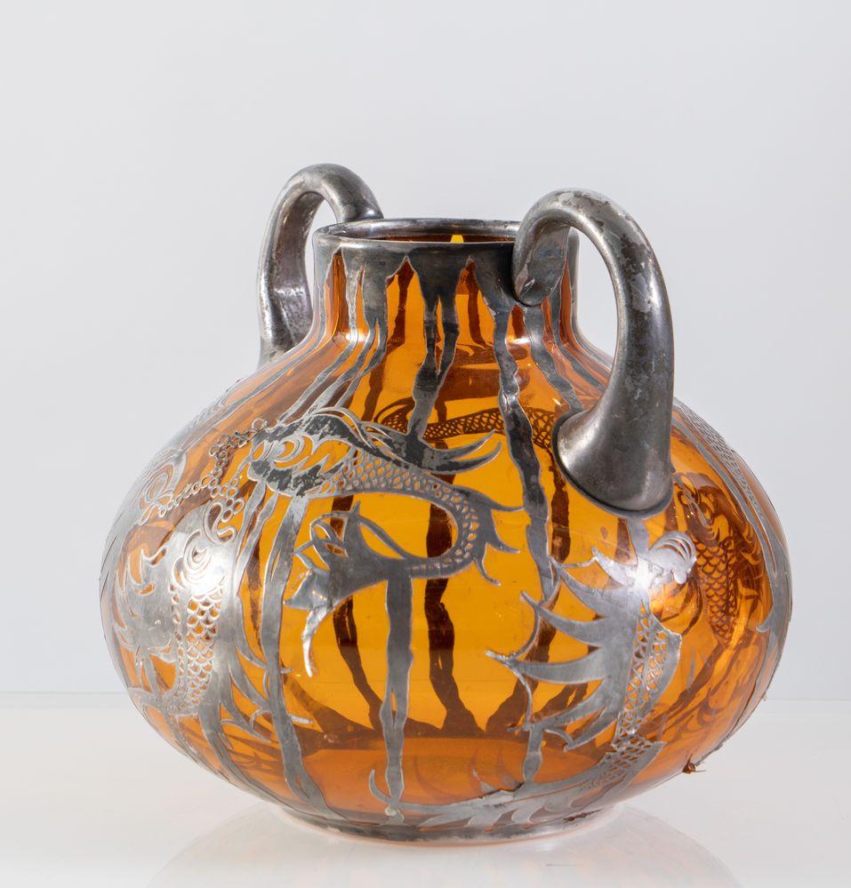 ARRIGO FINZI Vaso in vetro soffiato con applicazioni in argento. Marcho di originalità. Lievi difetti. Prod. Le Argenterie d'Italia, Italia, 1960 ca. Cm 22x23x23