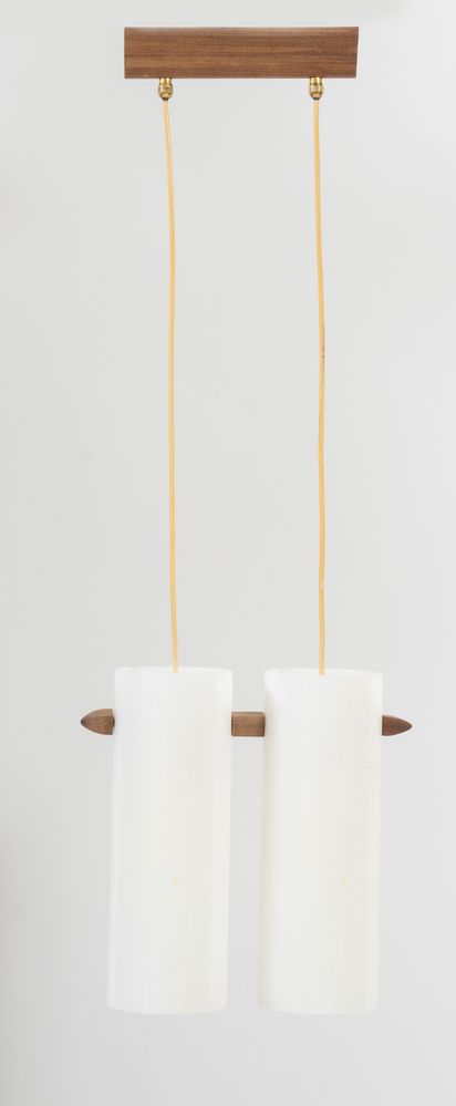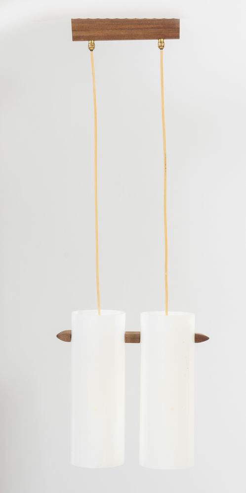 Lampadario con struttura in metallo, legno e paralumi in plexiglass. Prod. Svezia, 1960 ca. Cm 89x30x11