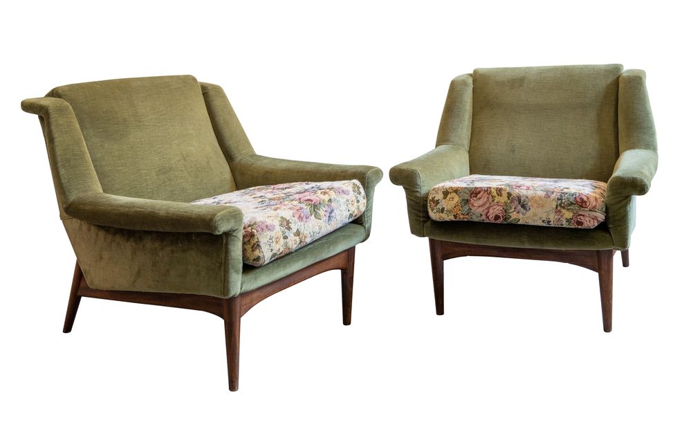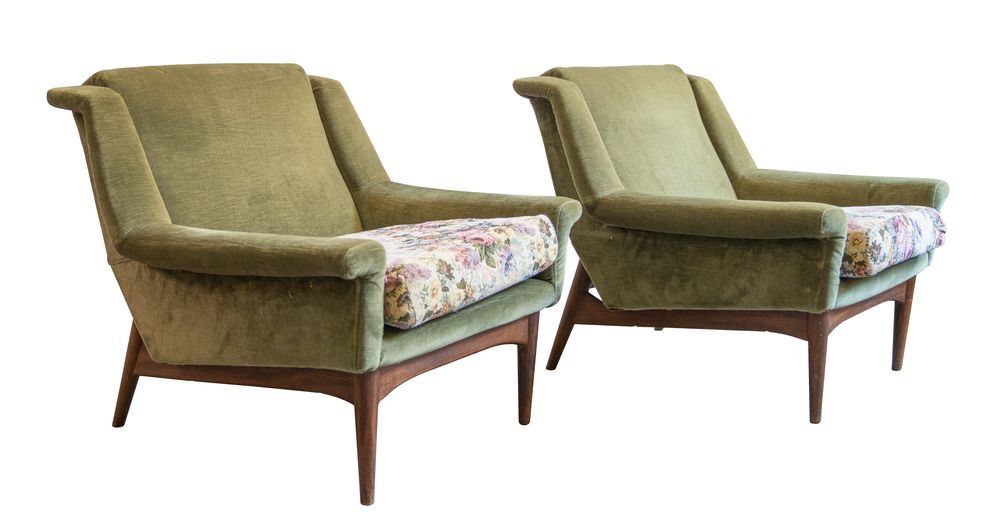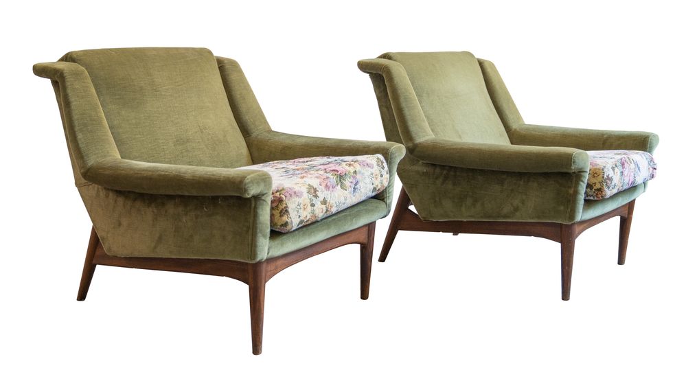 FRAMAR Coppia di poltrone con struttura in legno e rivestite in stoffa modello 'FM 117'. Prod. Italia, 1960 ca. Cm 75x76x80 Bibliografia: Pubblicazione su rivista
