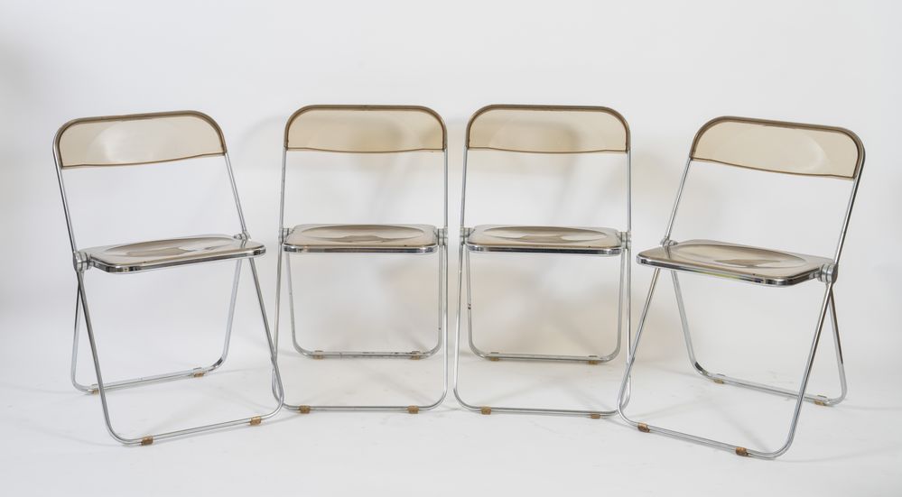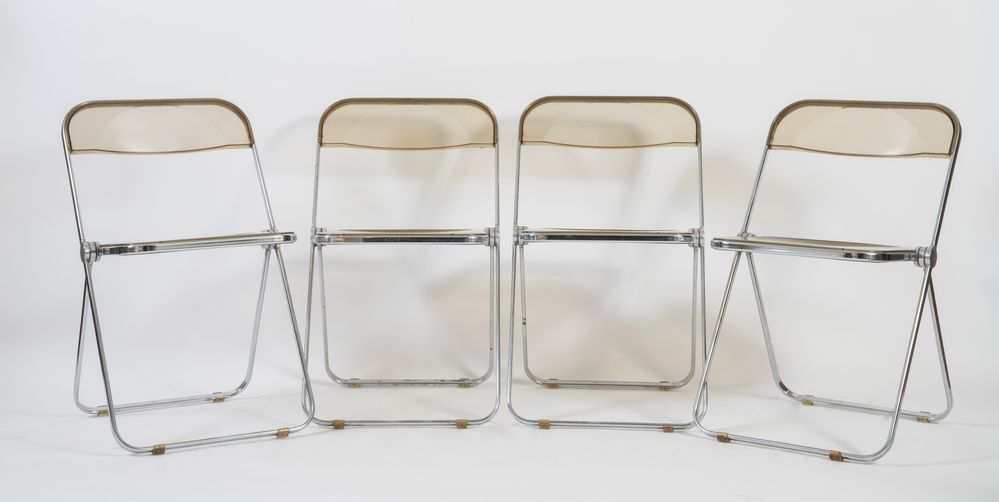 GIANCARLO PIRETTI quattro sedie con struttura in metallo; schienale e seduta in plastica, modello 'Plia'. Marchio originale. Lievi difetti. Prod. Anonima Castelli, Italia, 1967 Cm 75x45x50