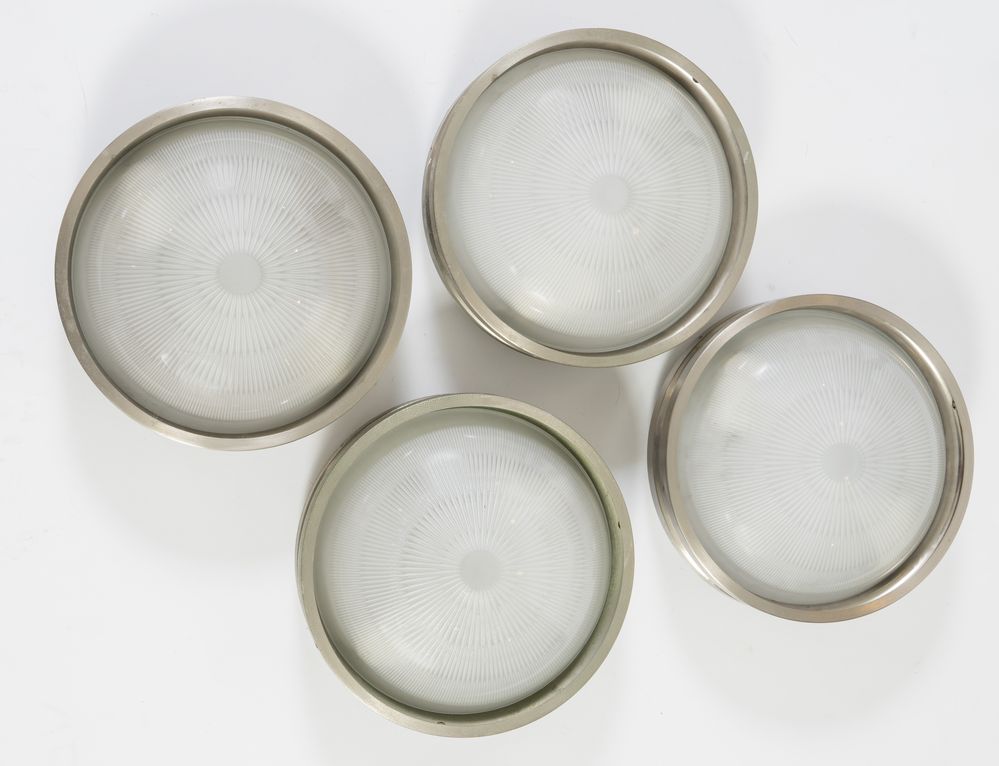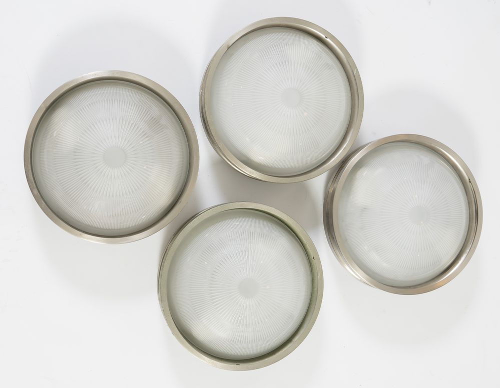 SERGIO MAZZA Quattro applique da parete con struttura in metallo e paralume in vetro modello 'Sigma'. Prod. Artemide, Italia, 1960 ca. Cm 12x26x26