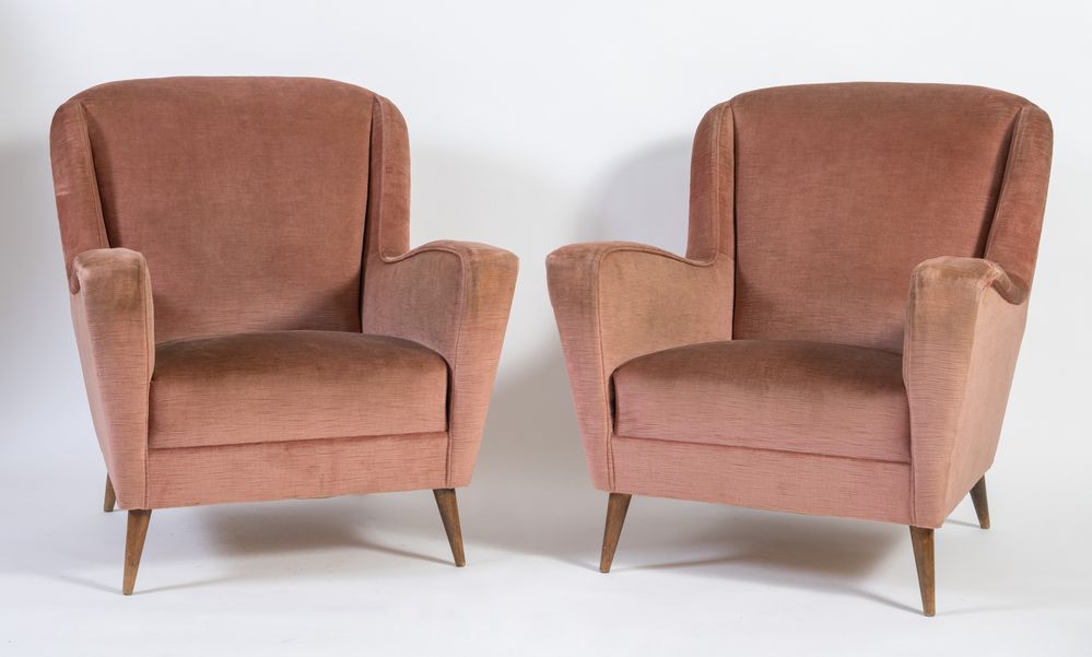 Coppia di poltrone con struttura in legno e rivestite in tessuto. Lievi difetti. Prod. Italia, 1960 ca. Cm 83x72x77