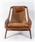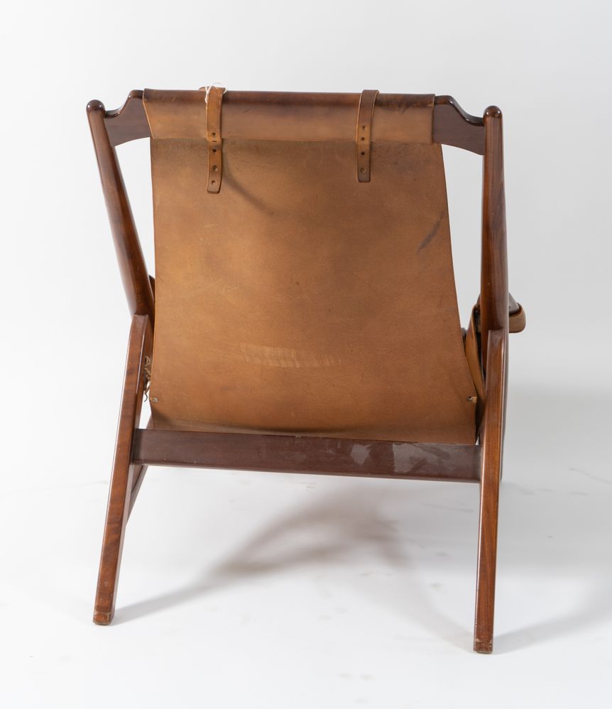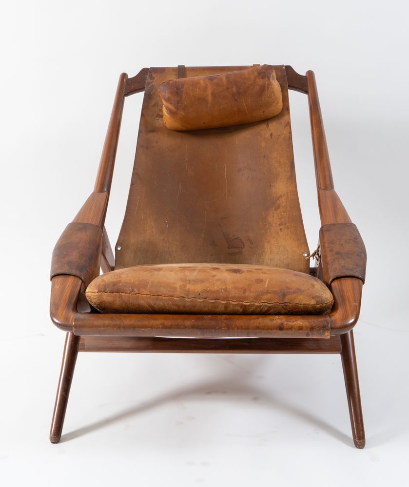 ARNE TIDEMAND RUUD (Attribuito) Poltrona in teak con seduta e schienale in pelle. Prod. Norvegia, 1950 ca. Cm 83,5x77x80