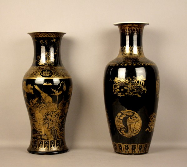 Firmato. Coppia di vasi in porcellana fondo nero con decorazioni in oro zecchino raff. ''UCCELLI''. Difetti (buco sotto la base). Lievi difetti all'oro. Cina. XIX secolo. Mis. Alt. cm. 40 ca.