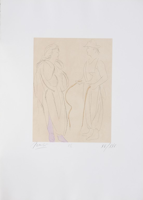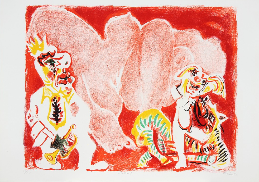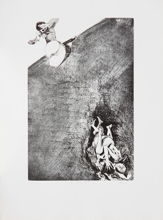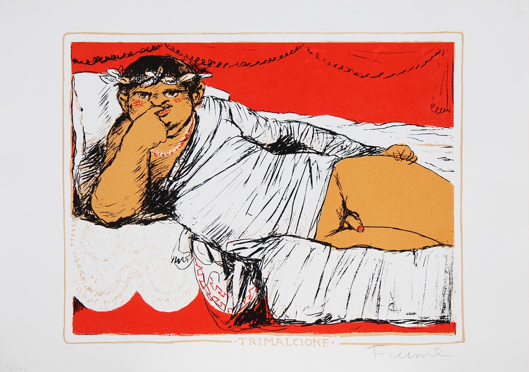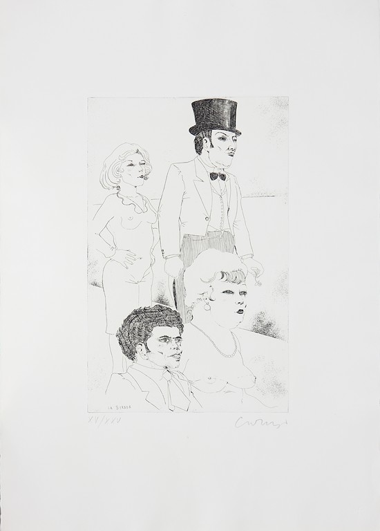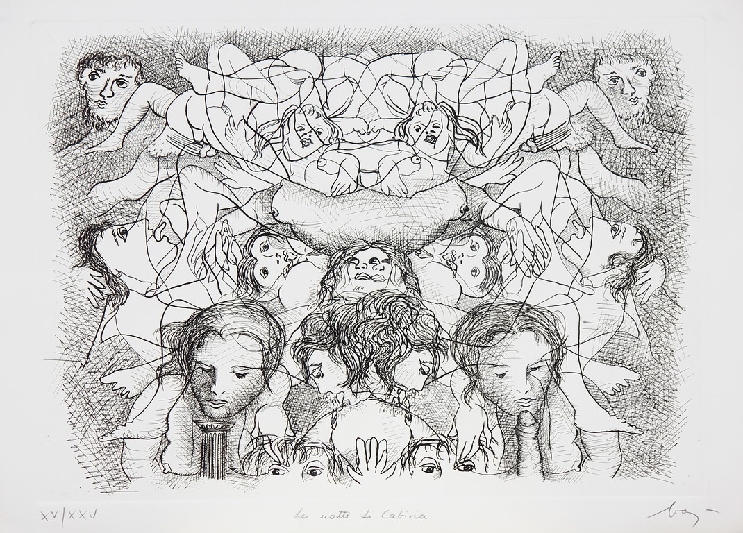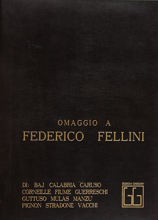 AUTORI VARI Omaggio a Federico Fellini. 1974. Serigrafia e litografia. Cm 50,00 x 70,00. Cartella contenente n.12 grafiche, tir. XV/XXV, degli artisti: Baj, Calabria, Caruso, Corneille, Fiume, Guerreschi, Guttuso, Mulas, Manzù, Pignon, Stradone, Vacchi. Edisioni Gregory, Roma. 1.Baj, Le notti di Cabiria,misure lastra:44x62cm, serigrafia, tir. e firma in basso a matita; 2.Calabria, La dolce vita, misure lastra: 50x32cm, serigrafia, tir. e firma in basso a matita; 3. Caruso, La strada, misure lastra:42x26,5 cm, serigrafia, tir. e firma in basso a matita; 4. Fiume, Trimalcione, litografia, misure lastra: 41x53 cm, tir. e firma in basso a matita; 5.Corneille, Il bidone, litografia, tir. firma e data in alto a matita; 6.Guerreschi, Roma, misure lastra: 30x20cm, serigrafia, tir. firma, titolo e data in basso a matita; 7. Guttuso, Boccaccio, serigrafia, misure lastra:61x40cm, tir. firma e titolo in basso a matita; 8. Mulas, Giulietta degli spiriti, misure lastra:45x36 cm, serigrafia, tir. e firma in basso a matita; 9. Manzù, 8 1/2, misure lastra: 36x27,5, serigrafia, tir. titolo e firma in basso a matita; 10. Pignon, Les clowns, misure lastra: 45x58cm, litografia, tir. titolo e firma in basso a matita; 11.Stradone, I Vitelloni, misure lastra:43x65cm, litografia, tir. titolo, firma e data in basso a matita; 12. Vacchi, Per Amarcord, misure lastra: 41x62 cm, litografia, tir., titolo e firma in basso a matita.