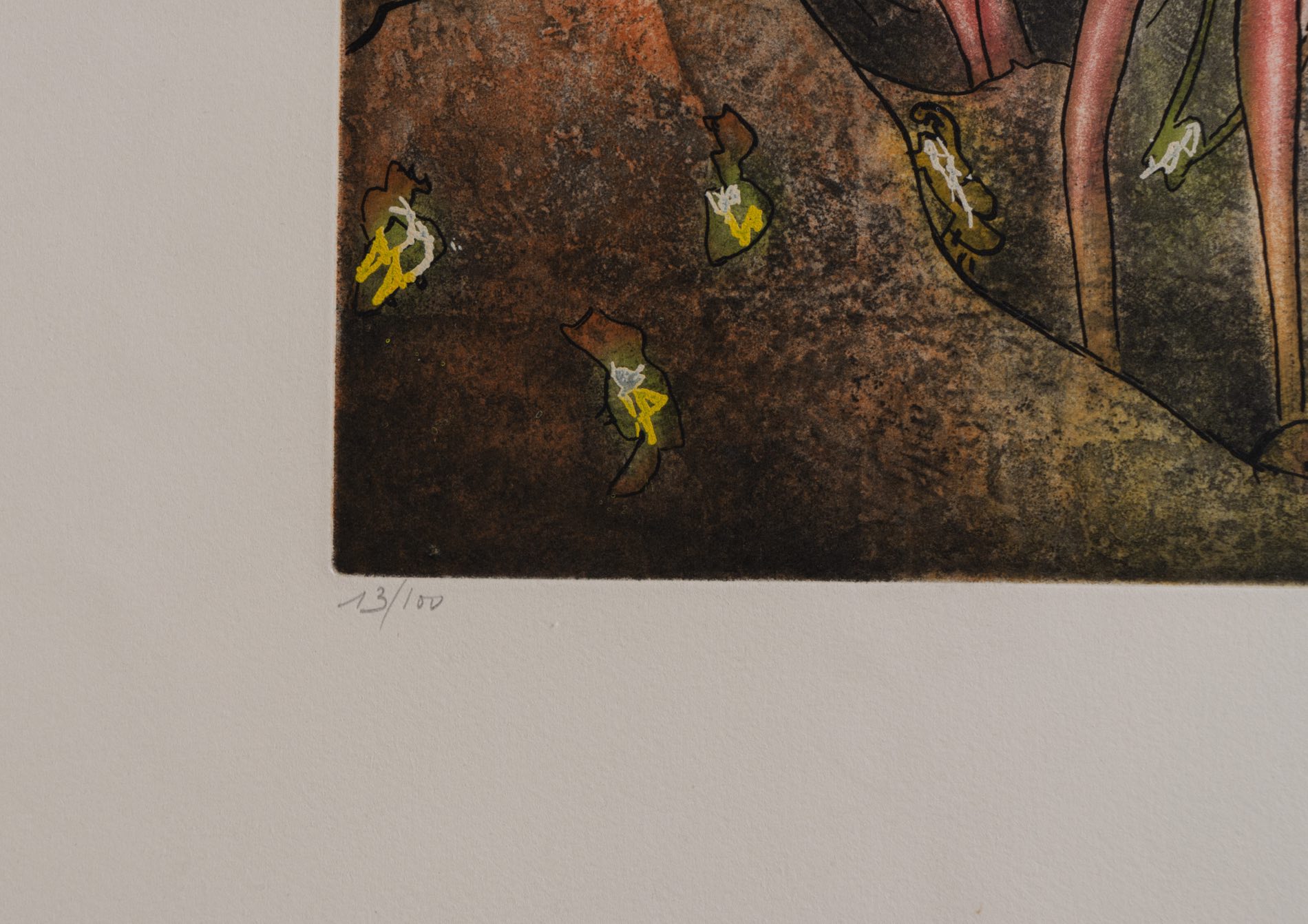 Roberto Sebastián Antonio Matta Echaurren (Santiago del Cile 1911 - Civitavecchia 2002), “Ma Chair Rie”, 1978.Acquaforte acquatinta a colori su carta, firmata in basso a destra, numero di tiratura in basso a sinistra 13/100, reca timbro a secco Galleria dello Scudo e altro timbro a secco, Lastra H cm 41x32