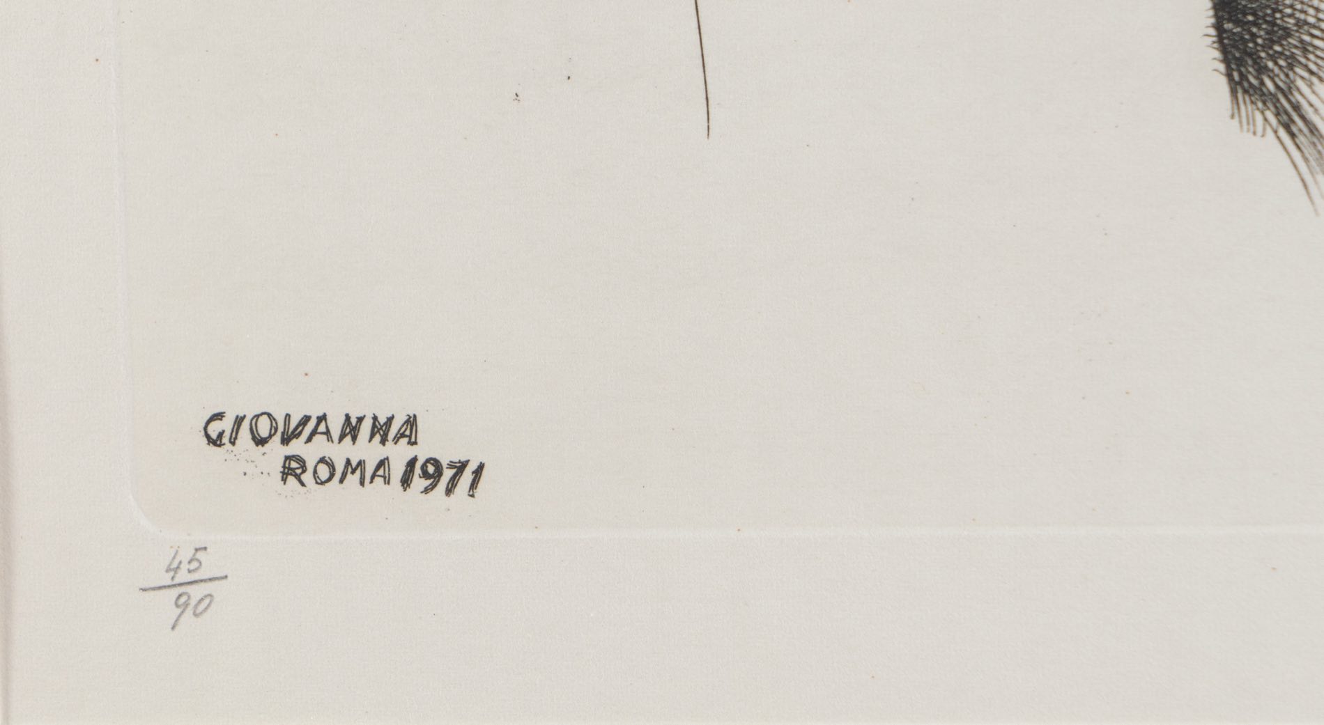 Emilio Greco (Catania 1913 - Roma1995), “Giovanna”, 1971.Acquaforte su carta, firmata in basso a destra “Emilio Greco”, numero tiratura in basso a sinistra 45/90, reca sulla lastra titolo, luogo e anno “Giovanna / Roma 1971”, Lastra H cm 49x34.5 - con cornice H cm 83x68.5