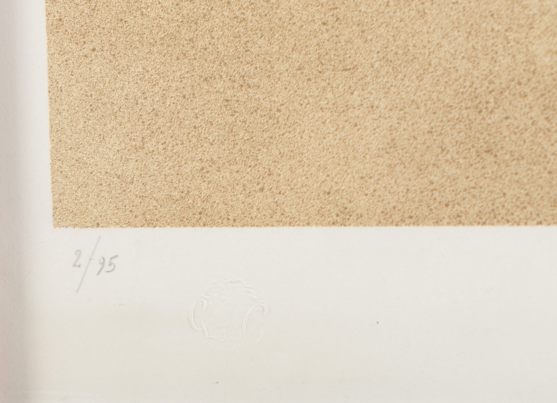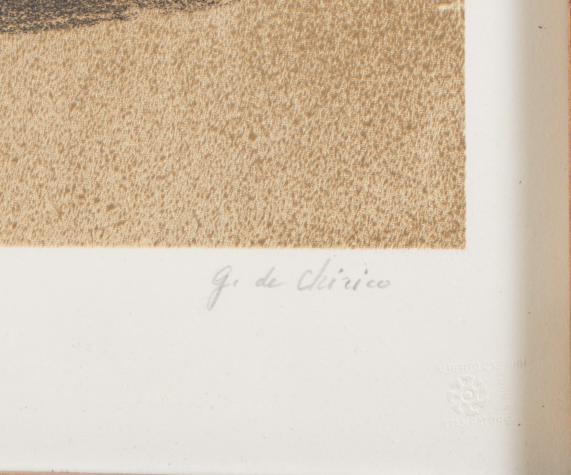 Giorgio De Chirico (Volo 1888 - Roma 1978), “Il riposo dell’archeologo”, 1972.Litografia a colori su carta, firmata in basso a destra “G. De Chirico”, numero di tiratura in basso a sinistra 2/95, reca timbri a secco “GdC/g. de Chirico” e “Alberto Caprini Stampatore in Roma”, Lastra H cm 58x43 - con cornice H cm 75x55